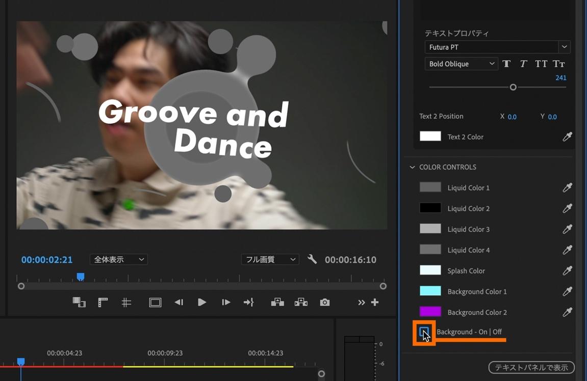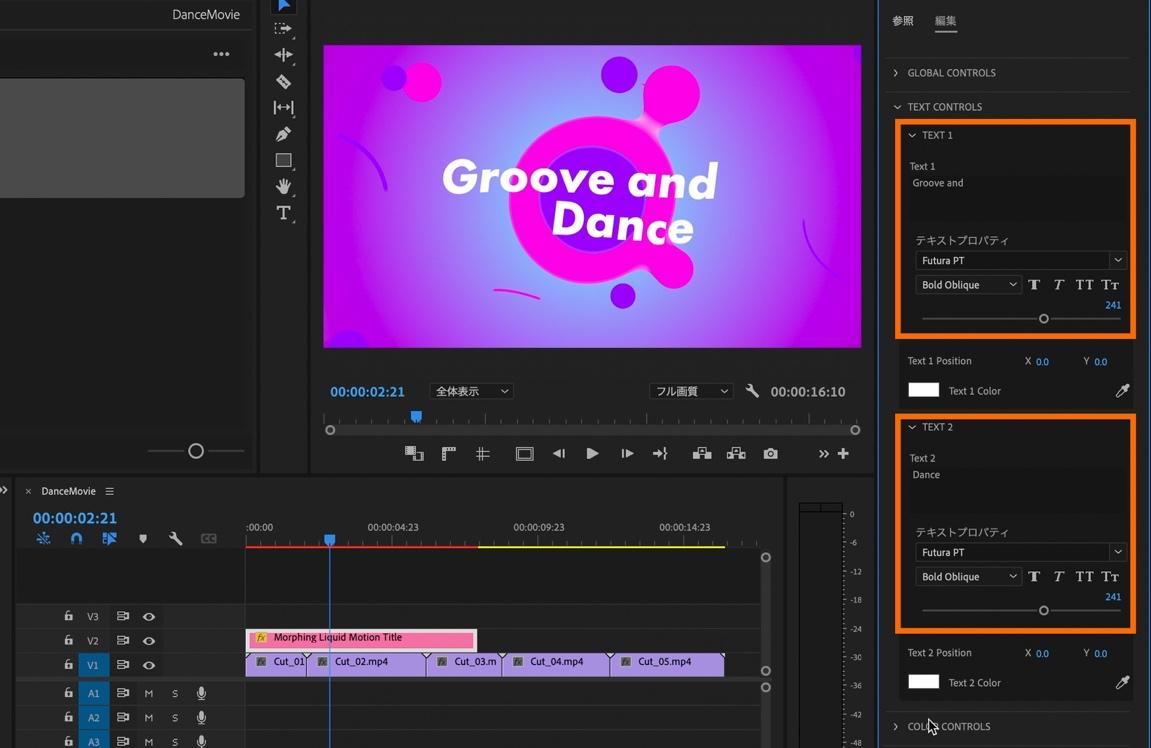 今回は、「Text 1」に『Groove and』「Text 2」に「Dance」と入力してどちらも「Tutura PT」Bold Obliqueのフォントを使用しています。