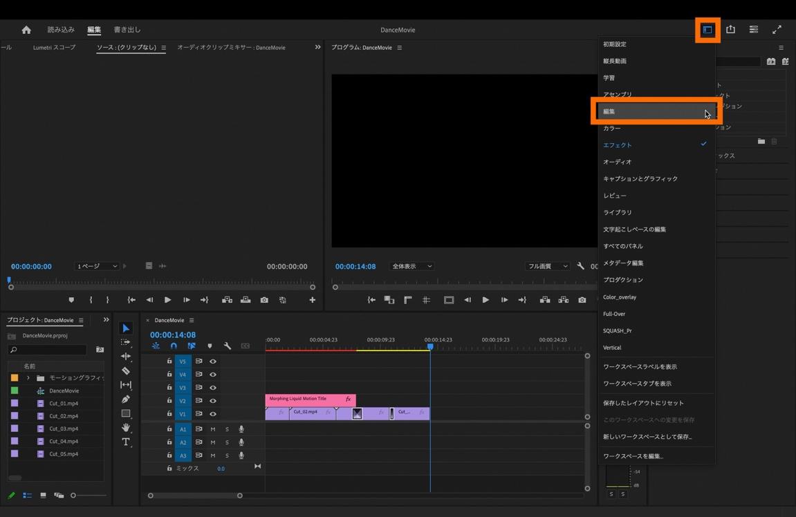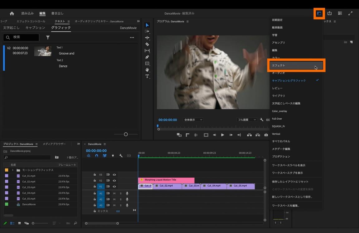 エフェクトの編集なので、画面右上にある「ワークスペース」を選択してワークスペースの表示を「エフェクト」に切り替えます。