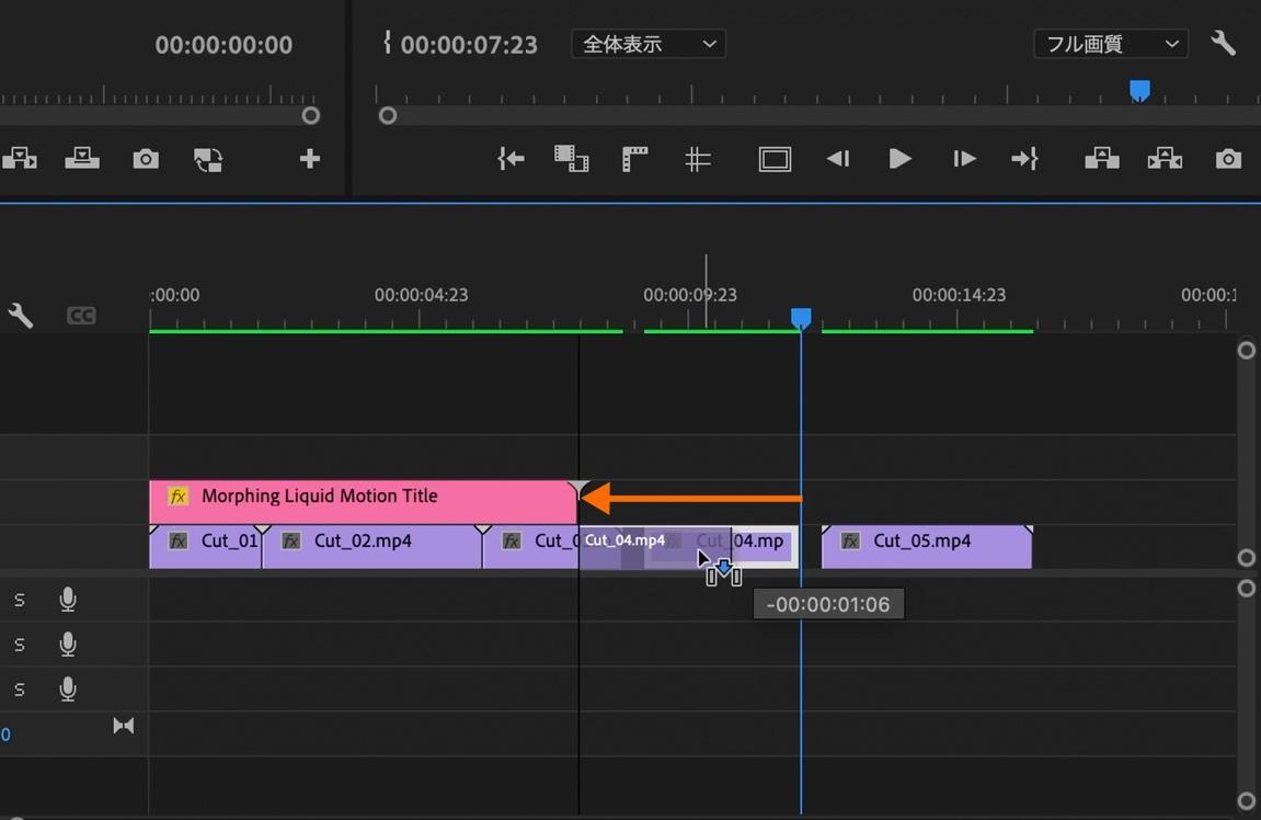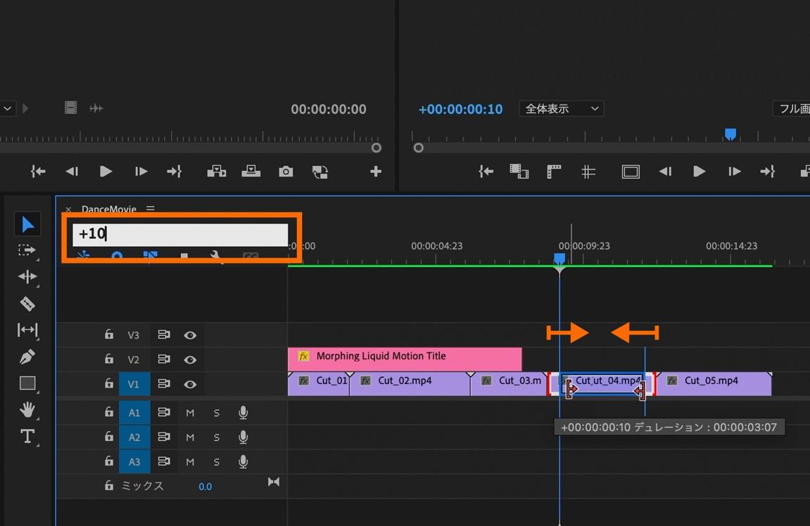 トランジションを適用するにはクリップの前後に余白が必要なので、まずは適用したいクリップの前後10フレームずつをカットします。(タイムラインパネル上の左上タイムコードに「-10」や「+10」など移動したい数値を入力することで正確に再生ヘッドを移動することが可能です)