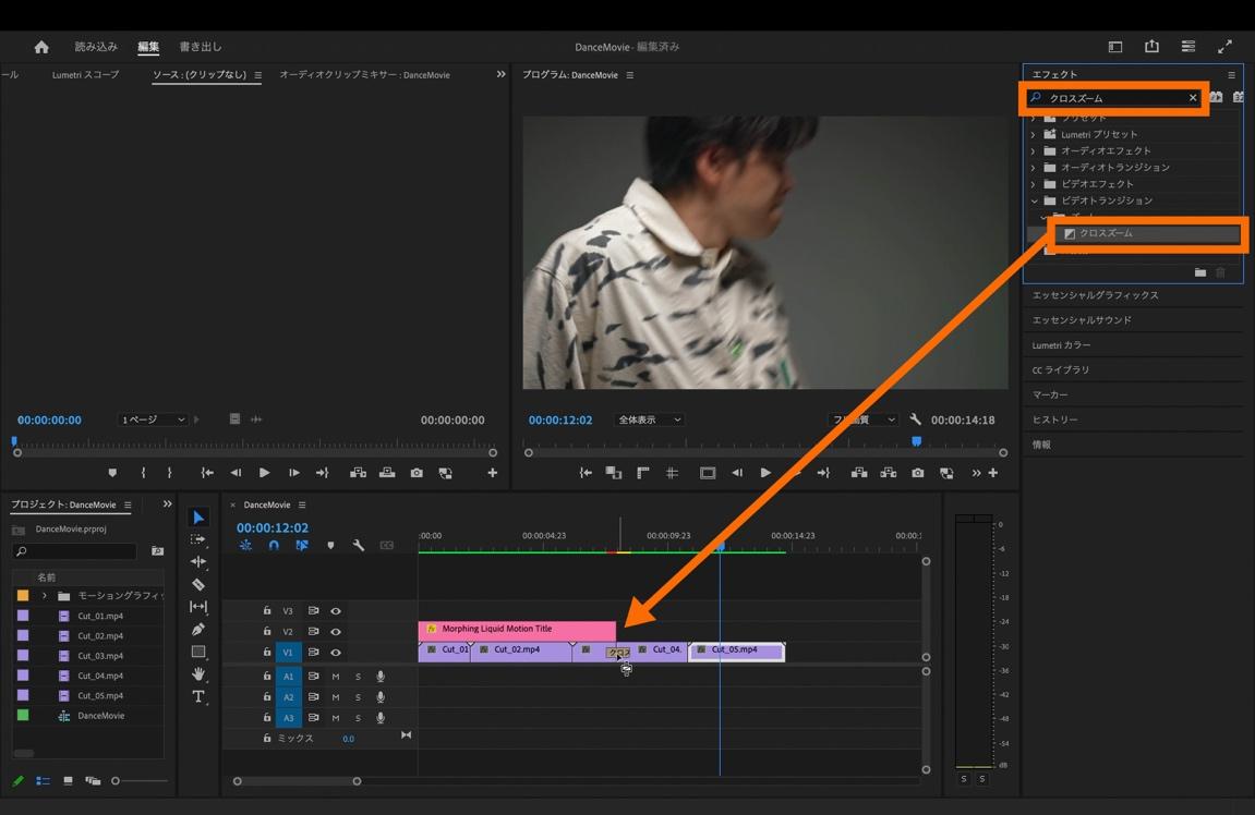 「エフェクトパネル」内の検索フィールドに「クロスズーム」と入力します。「クロスズーム」が表示されたら、タイムラインパネル上の該当クリップの間(今回はCut_03とCut_04の間)にドラッグ&ドロップします。