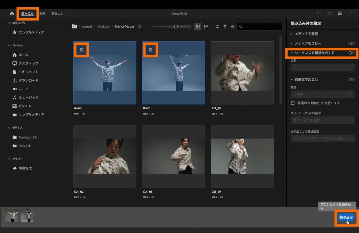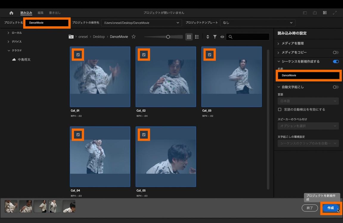 プロジェクトの新規作成画面が表示されたら、プロジェクト名とシーケンス名を任意で設定。今回は「DanceMovie」に変更し、「ローカル」の欄から事前にダウンロードした素材を選んでチェックボックスにチェックを入れて右下の「作成」を選択します。