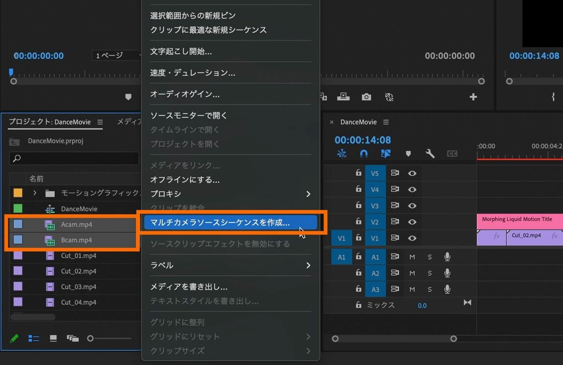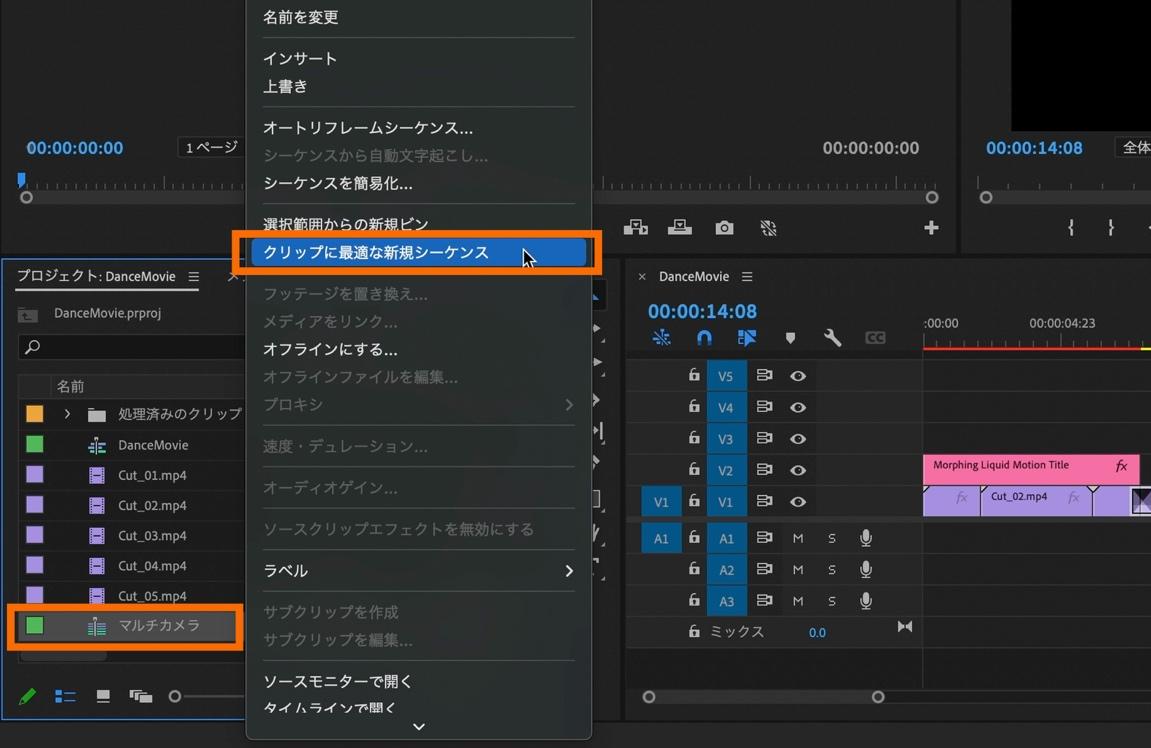プロジェクトパネル内で、読み込んだ撮影素材を選択した状態で右クリック、プルダウンの中から「マルチ〜シーケンスを作成...」を選択します。