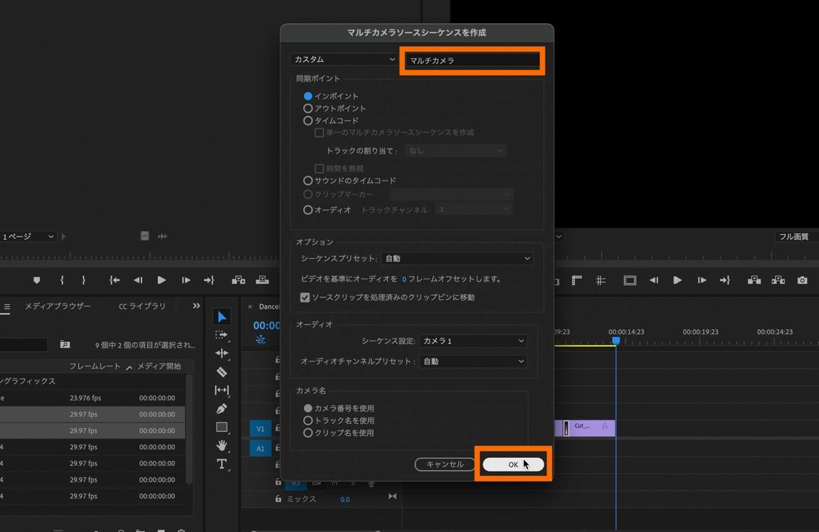「マルチカメラソースシーケンス」を作成のポップアップが表示されたら作成するシーケンスの名称を任意で変更し「OK」を選択。(今回は「マルチカメラ」という名称に設定)