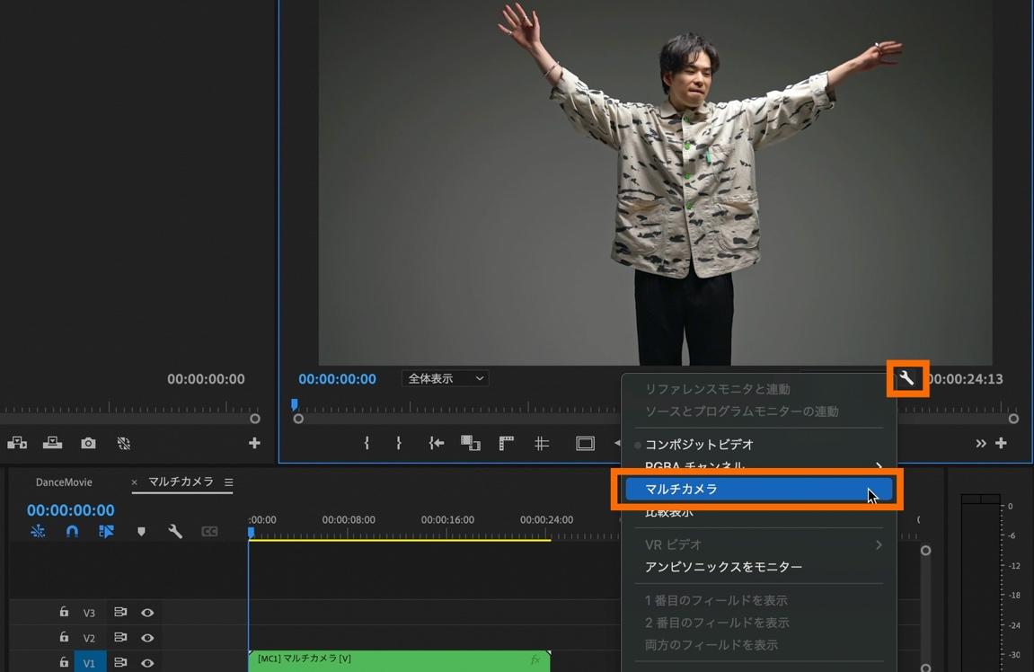 プログラムパネル右下のスパナのアイコンを選択し、プルダウンの中から「マルチカメラ」を選択してマルチカメラをプログラムパネルに表示させます。