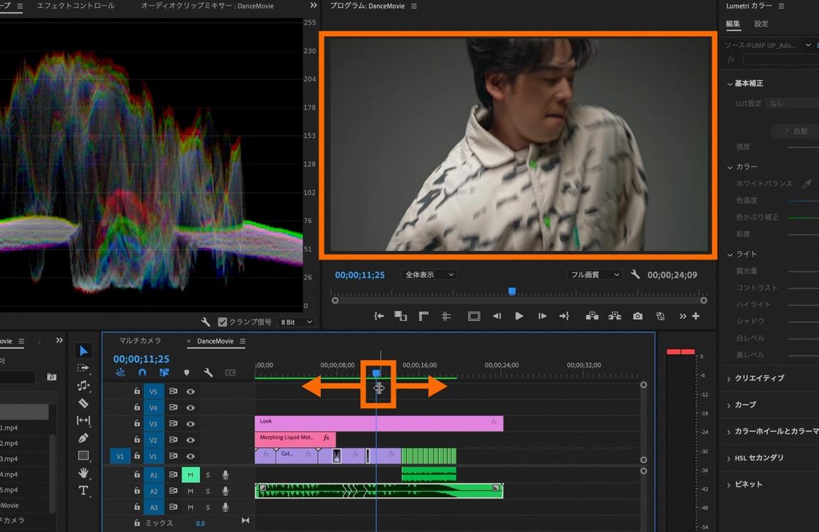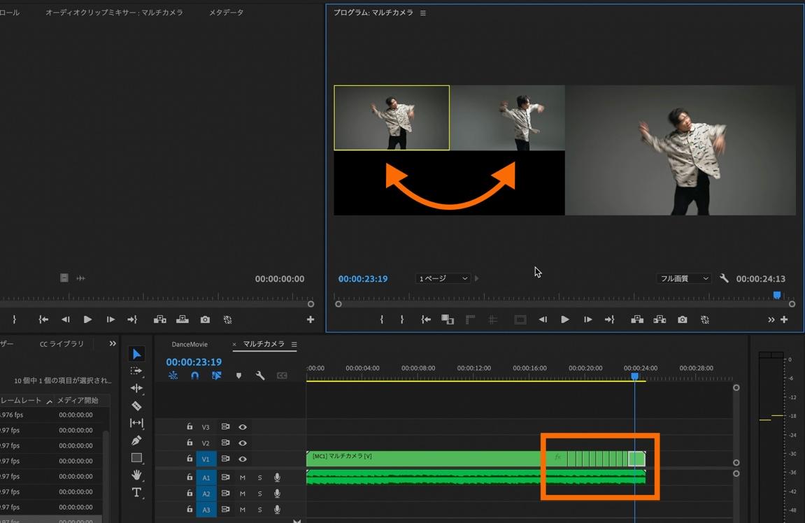 タイムライン上で映像を再生し、カメラを切り替えたいタイミングで別のクリップを選択。
