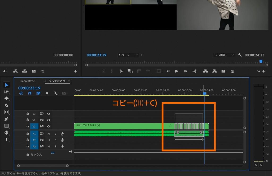 カットしたクリップを全て選択して素材をコピー(キーボードの場合Mac:command⌘+C, Windows:Ctrl+C)します。