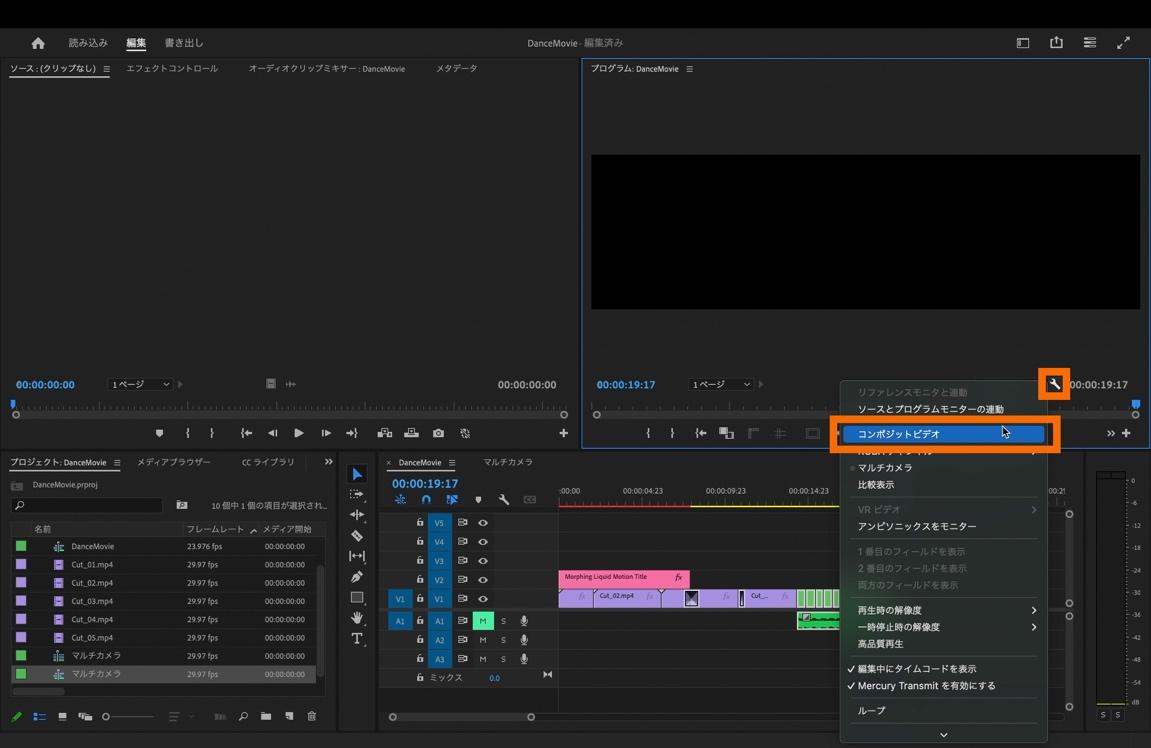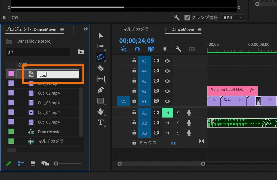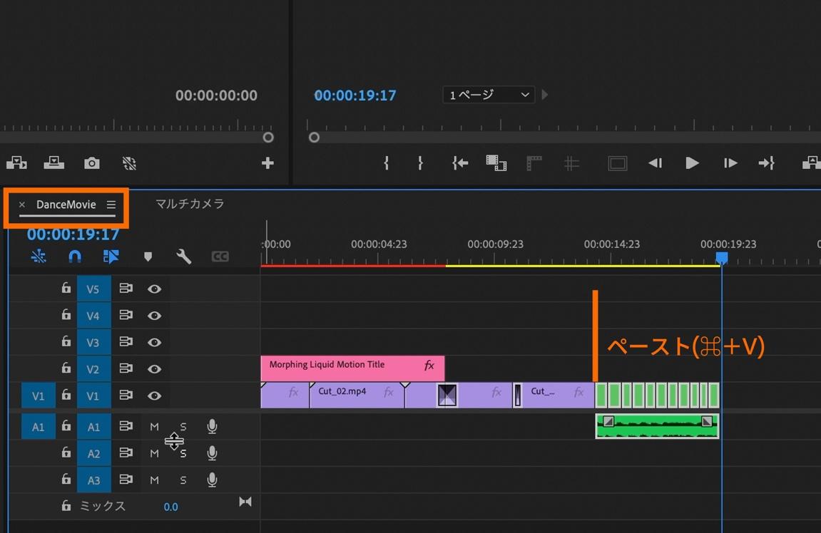 元々編集していたシーケンス(今回の場合DanceMovieのシーケンス)を開き、STEP2までの編集の末尾へクリップをペースト(キーボードの場合は Mac: command⌘+V、Windows:Ctrl+V)します。
