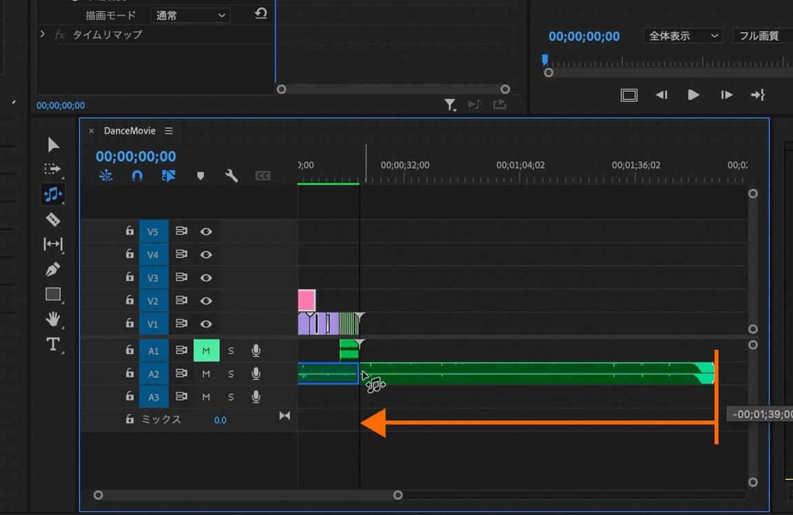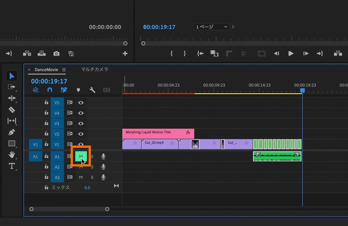 今回はクリップの音声は使用しないので、タイムラインパネル内のA1クリップの「Mマーク」を選択して音声をミュートにします。