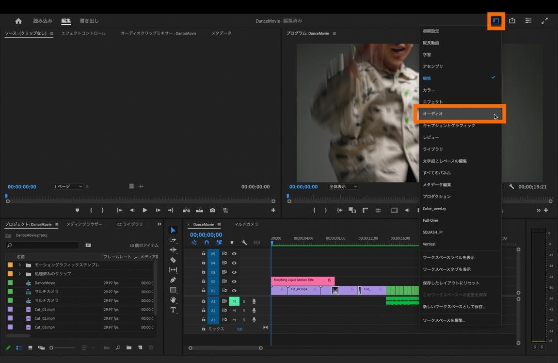 オーディオの編集なので、画面右上にある「ワークスペース」を選択してワークスペースの表示を「オーディオ」に切り替えます。