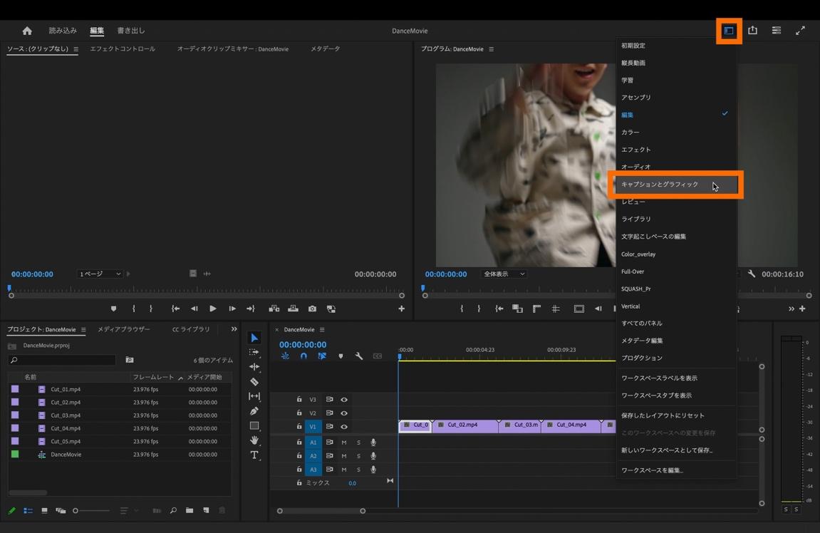 モーションテングラフィックスプレートでの編集なので、画面右上にある「ワークスペース」を選択してワークスペースの表示を「キャプションとグラフィック」に切り替えます。