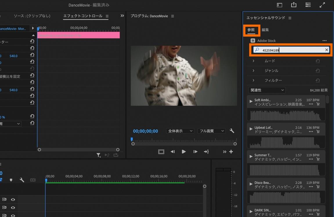 「エッセンシャルサウンドパネル」から「参照」のタブを選択し、お好きな楽曲を選びます。