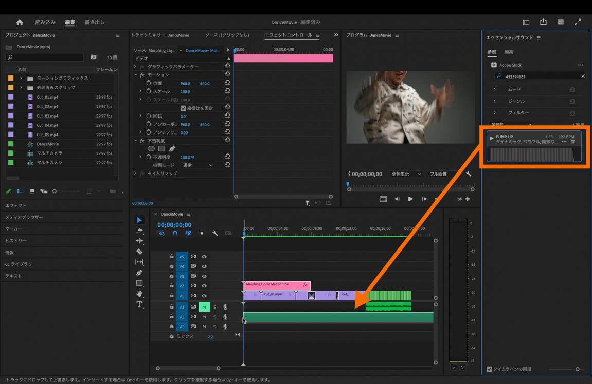 「PUMP UP」の楽曲が表示されたらタイムラインパネル上の「A2」にドラッグ&ドロップします。