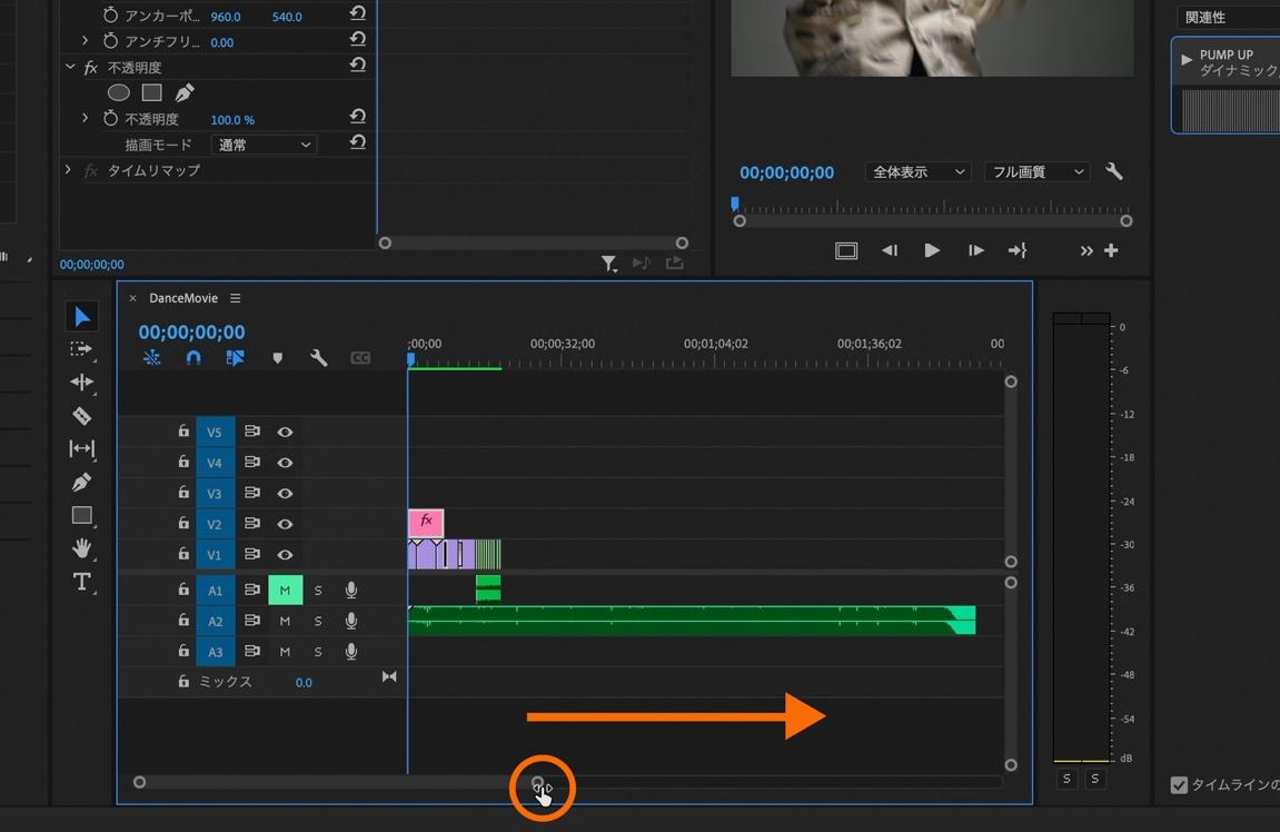 楽曲のクリップ全体が見えるように、タイムラインパネル下部のスケールを調整します。