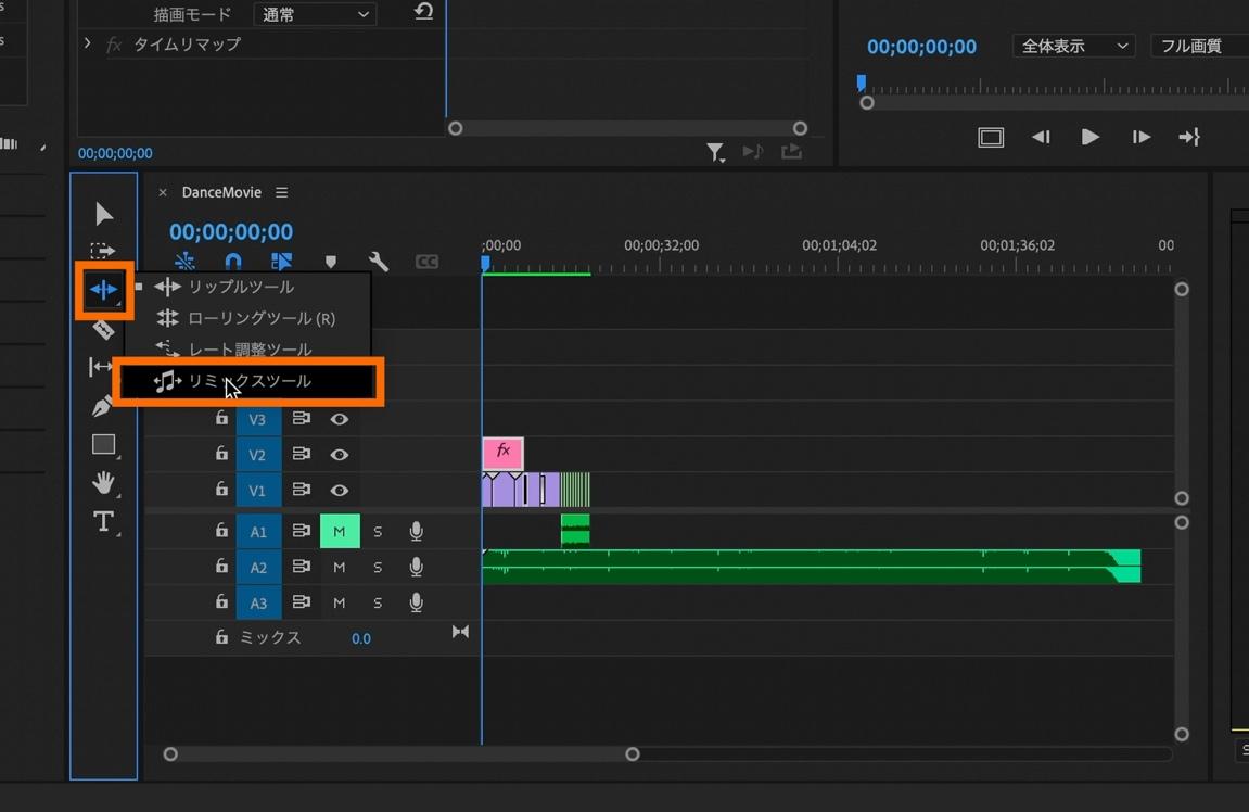 タイムラインパネル横にある「ツールバー」内の「リップルツール」を右クリックしてプルダウンから「リミックスツール」を選択します。