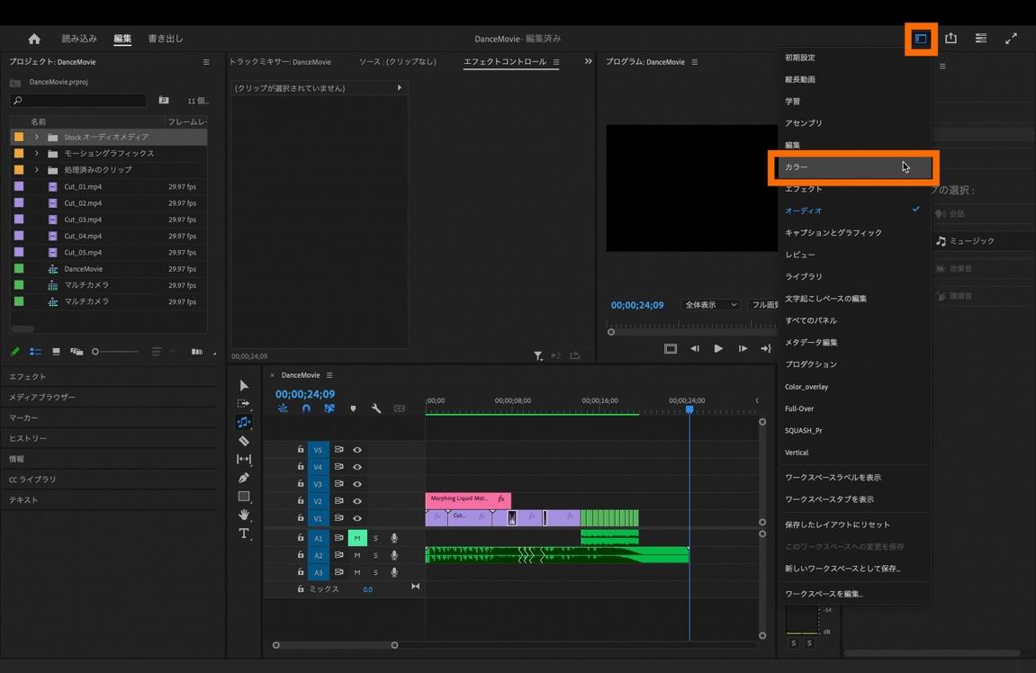 色味の編集なので、画面右上にある「ワークスペース」を選択してワークスペースの表示を「カラー」に切り替えます。