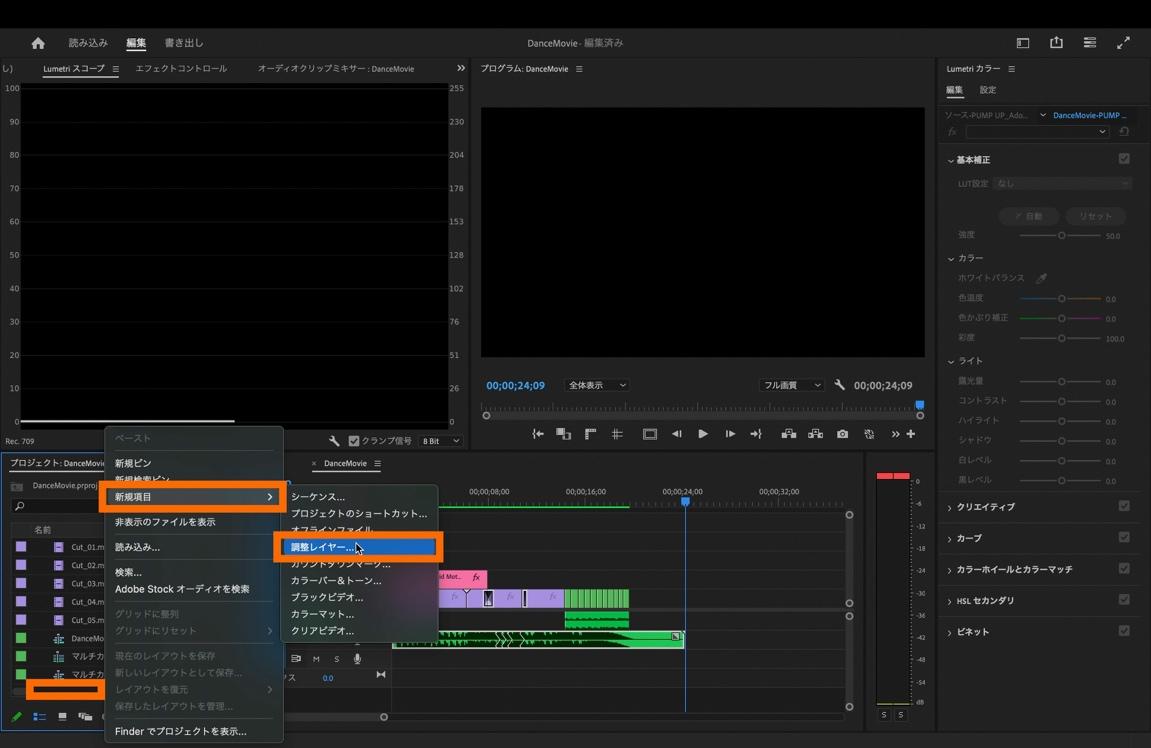 プロジェクトパネル内の空欄(何もない部分)を右クリックしてプルダウンの中から「新規項目」→「調整レイヤー」を選択して調整レイヤーを作成します。
