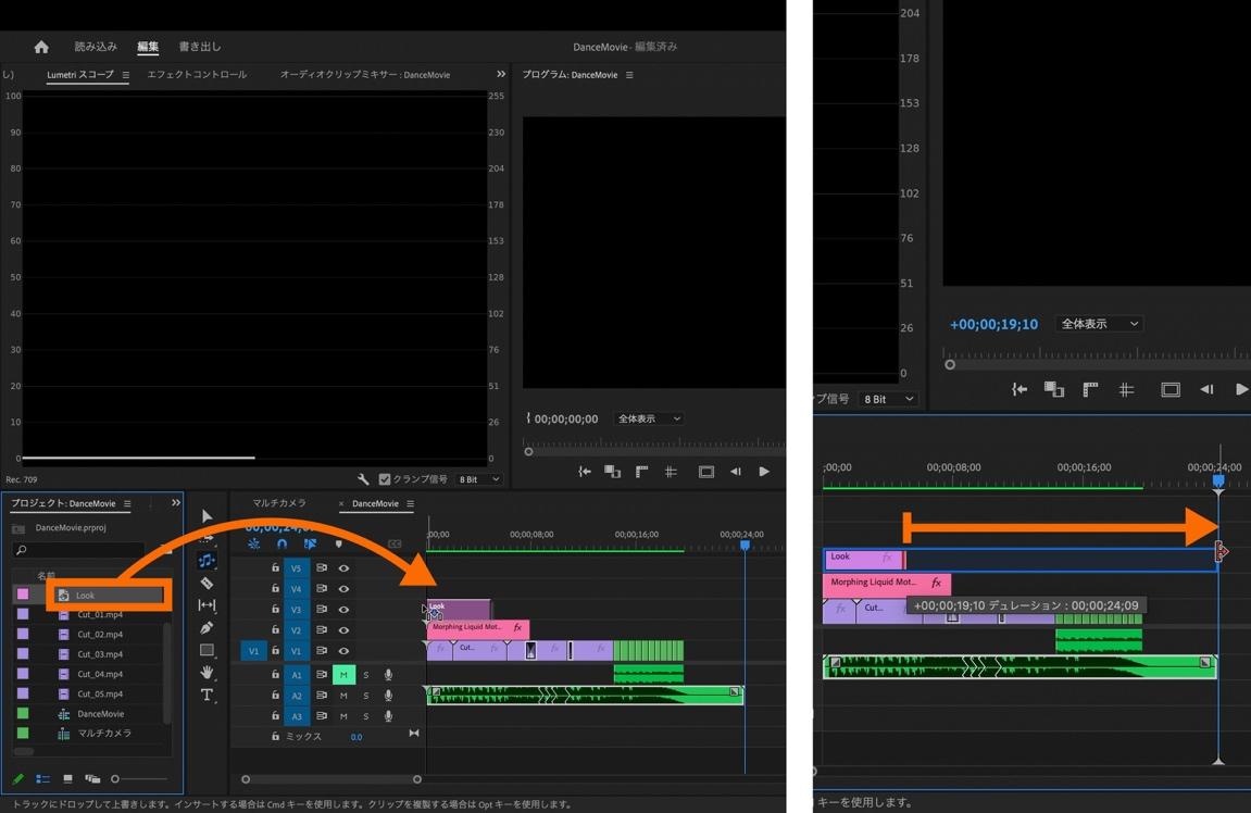 「Look」の調整レイヤーをSTEP4までに編集したクリップの上層(V3)へドラッグ&ドロップし、調整レイヤークリップの末尾を映像の終点までドラッグして伸ばします。