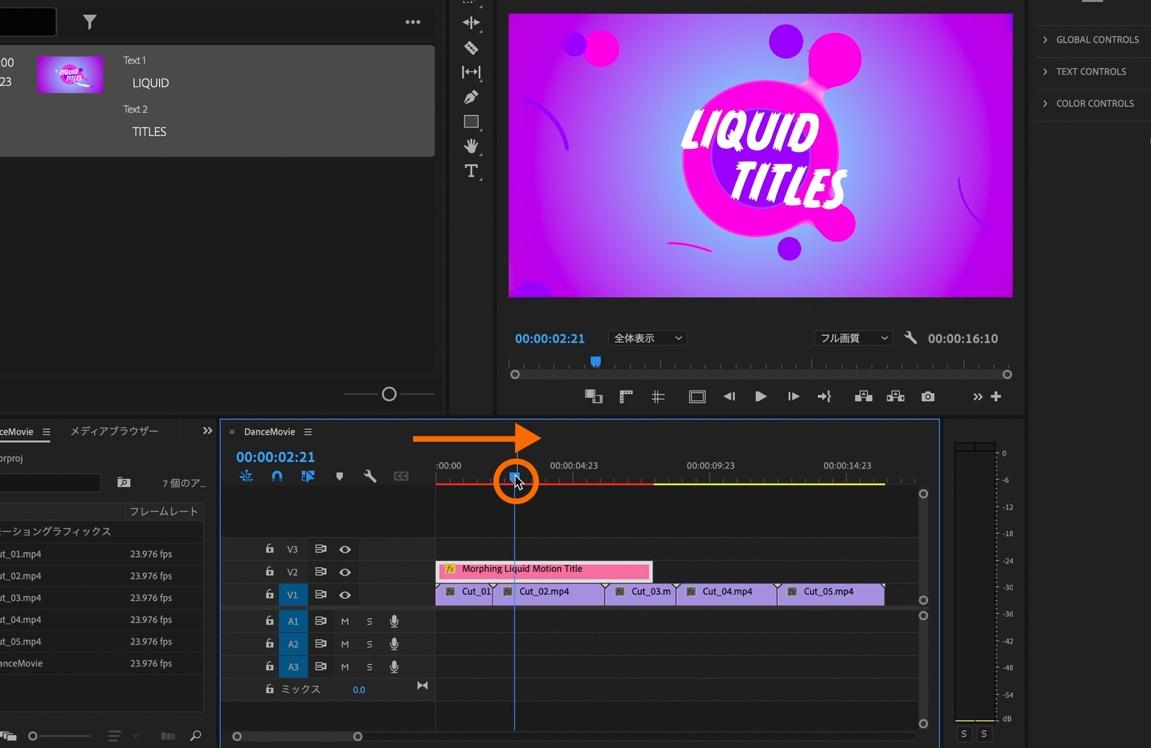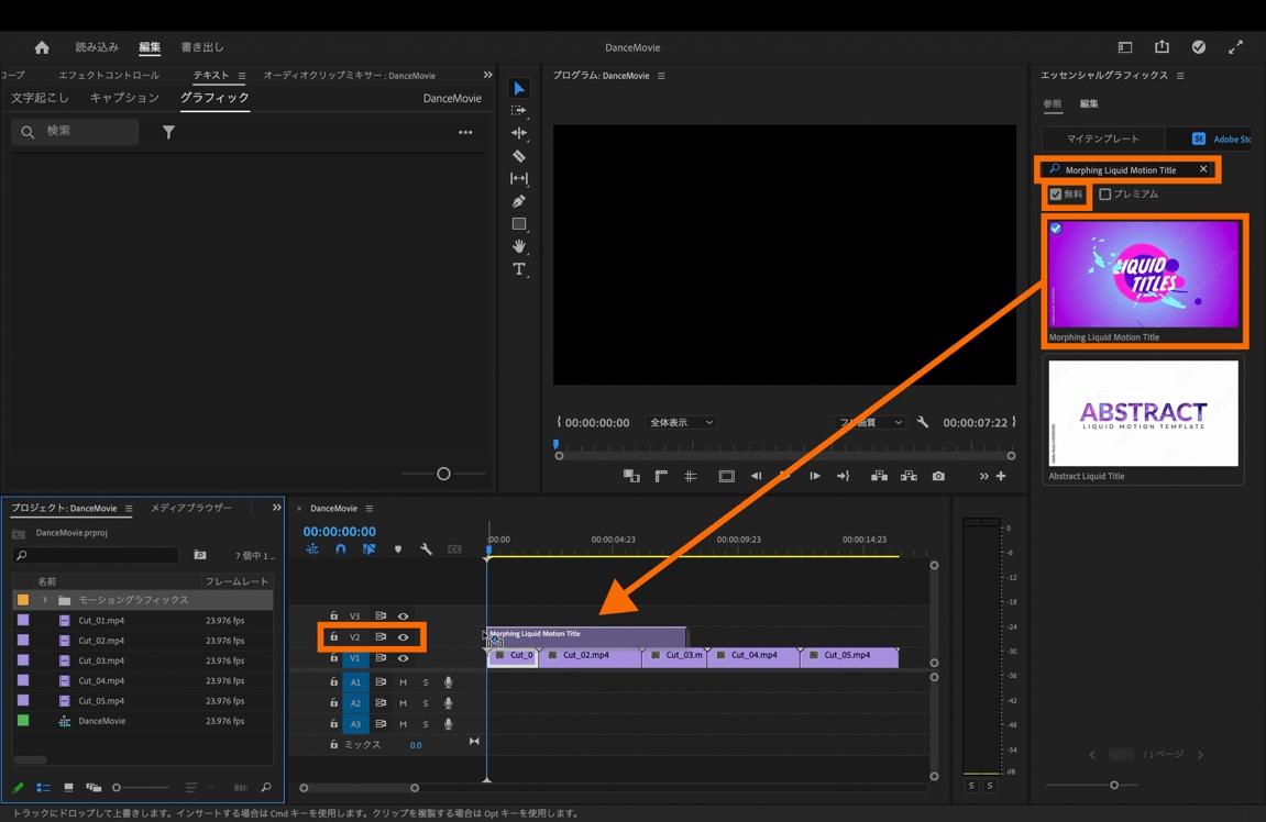 「無料」にチェックを入れたら、パネルの検索フィールドに「Morphing Liquid Motion Title」と入力します。「Morphing Liquid Motion Title」が表示されたら、タイムラインパネル上の[V2]にドラッグ&ドロップします。