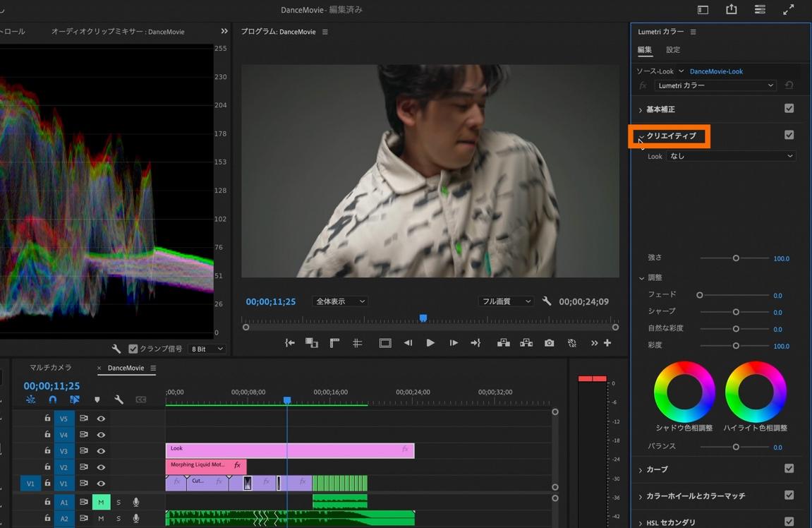 「Look」の調整レイヤーを選択した状態で、Lumetriカラーパネル内の「クリエイティブ」横にある>マークを開きます。