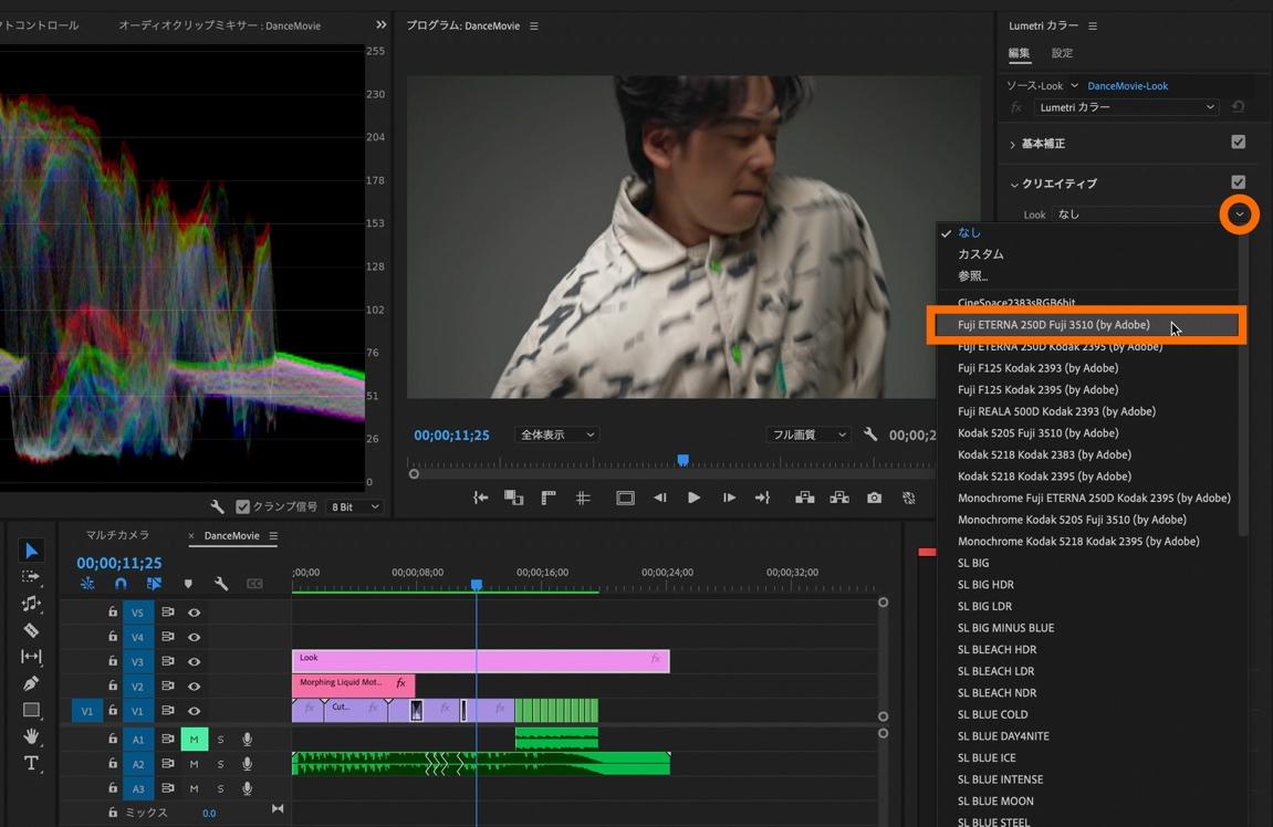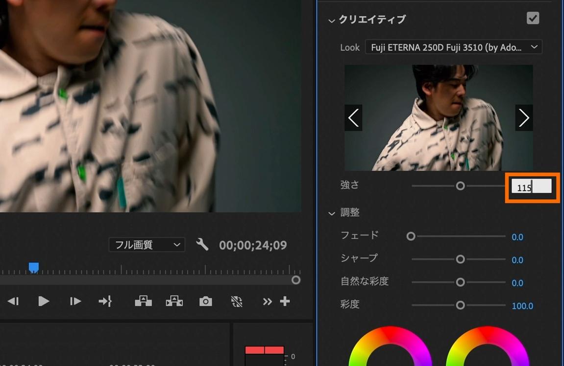 「クリエイティブ」内の「Look」のプルダウンから「Fuji ETERNA 250D Fuji 3510 (by Adobe)」を選択します。
