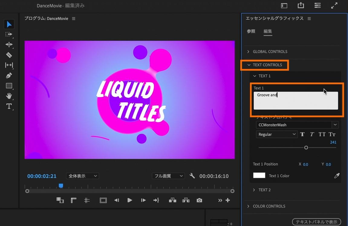 エッセンシャルグラフィックスパネル内にある「TEXT CONTROLS」項目から「TEXT1」の中にある「Text 1」に既存で入っているサンプルテキストを削除してご自身の表示したいテキストを入力します。