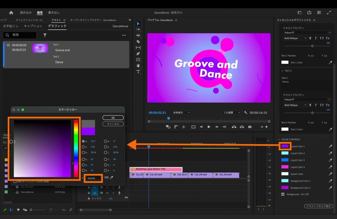 エッセンシャルグラフィックスパネル内の「COLORS CONTROLS」項目の中にある「Liquid Color 1」の色指定部分をクリックして「カラーピッカー」を表示させ、お好みの色味を選択します。