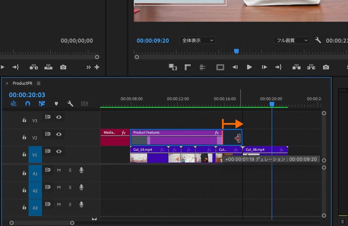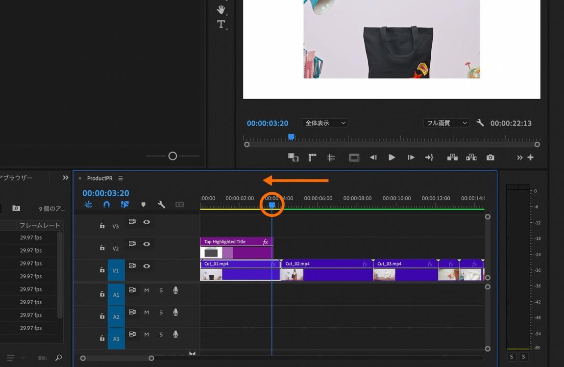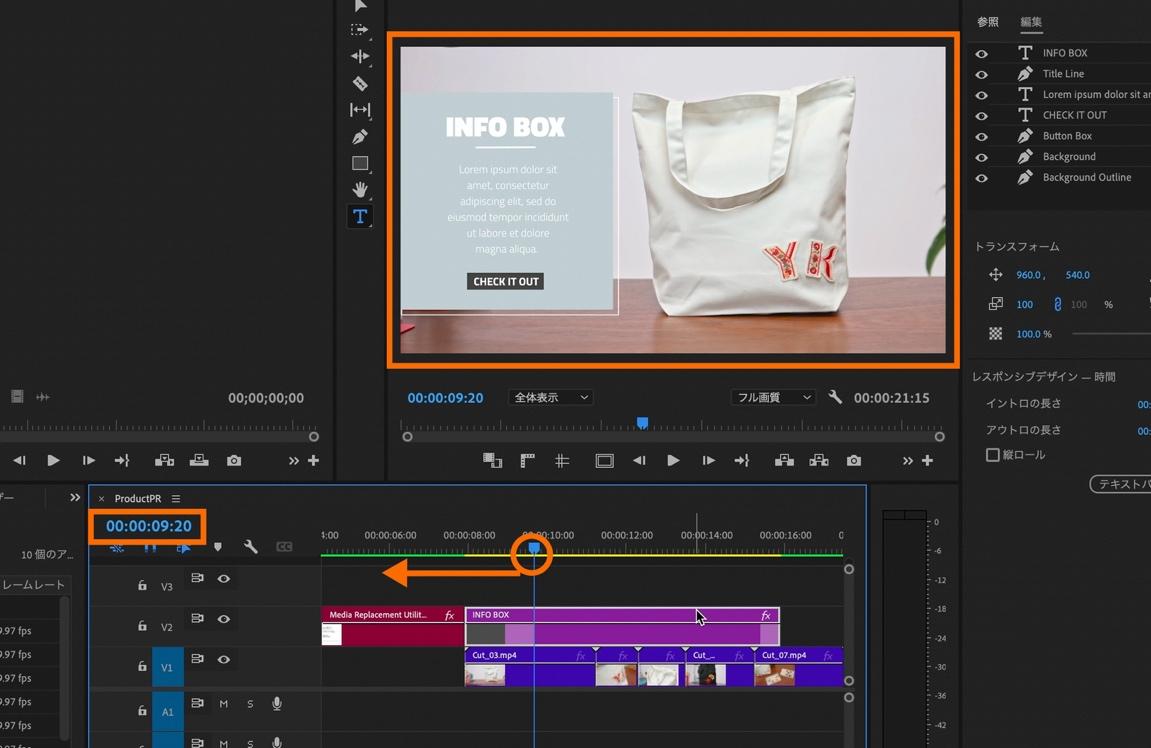 再生ヘッドをタイトルが表示されている時点(00:00:09:20)まで移動させます。