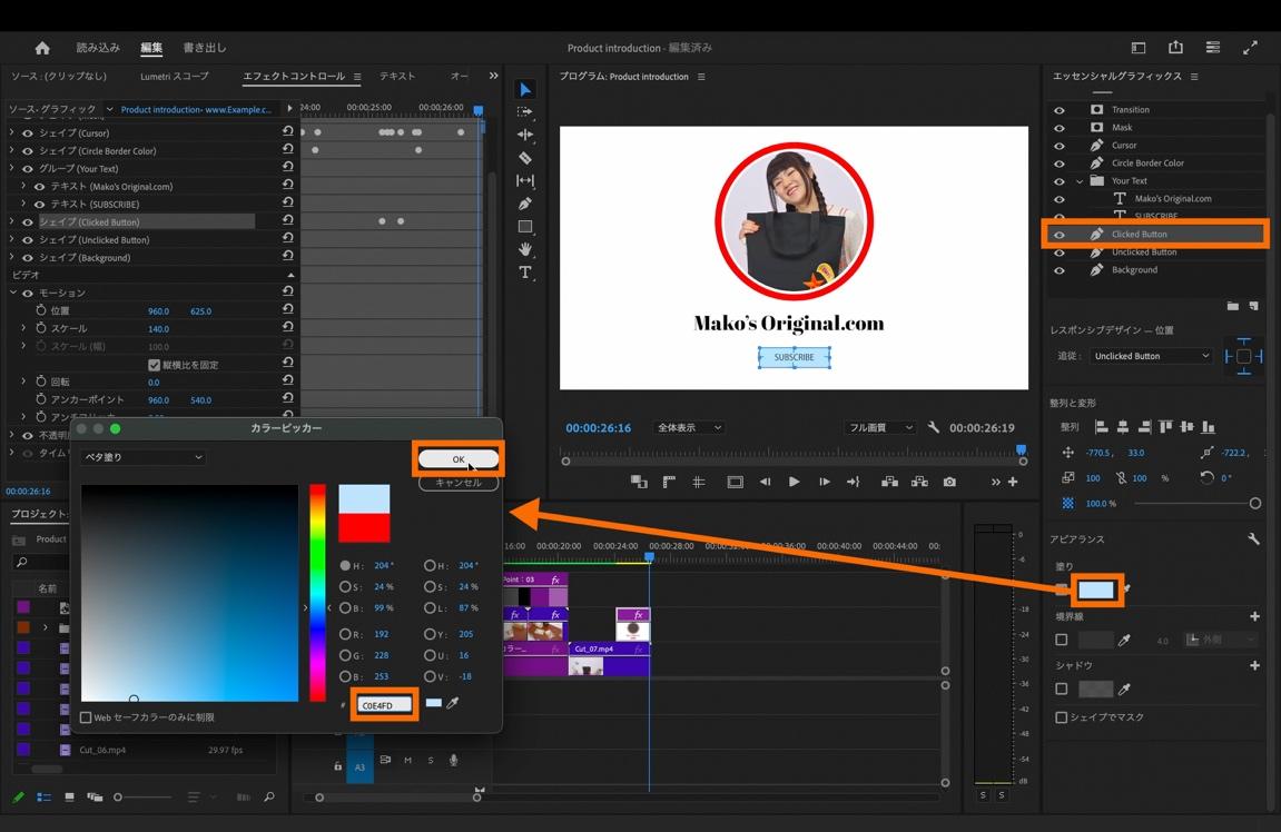 エッセンシャルグラフィックスパネル内の「Clicked Button」を選択し、アピアランス内の「塗り」の横にある色指定の部分をクリックして「カラーピッカー」からお好みの色味を選択します。