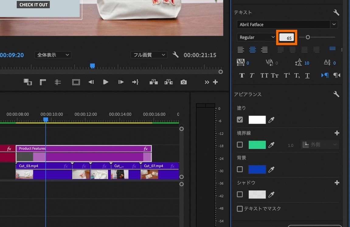 エッセンシャルグラフィックス内の「テキスト」内にある、フォントサイズの数値は65に変更します。