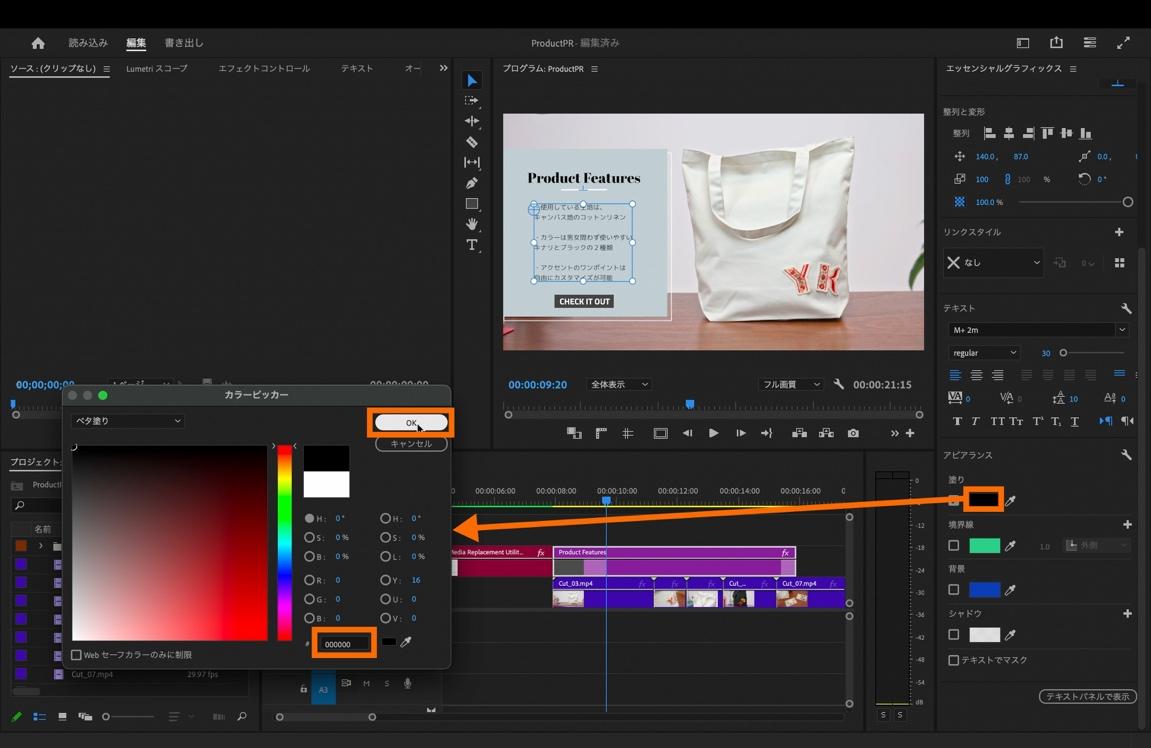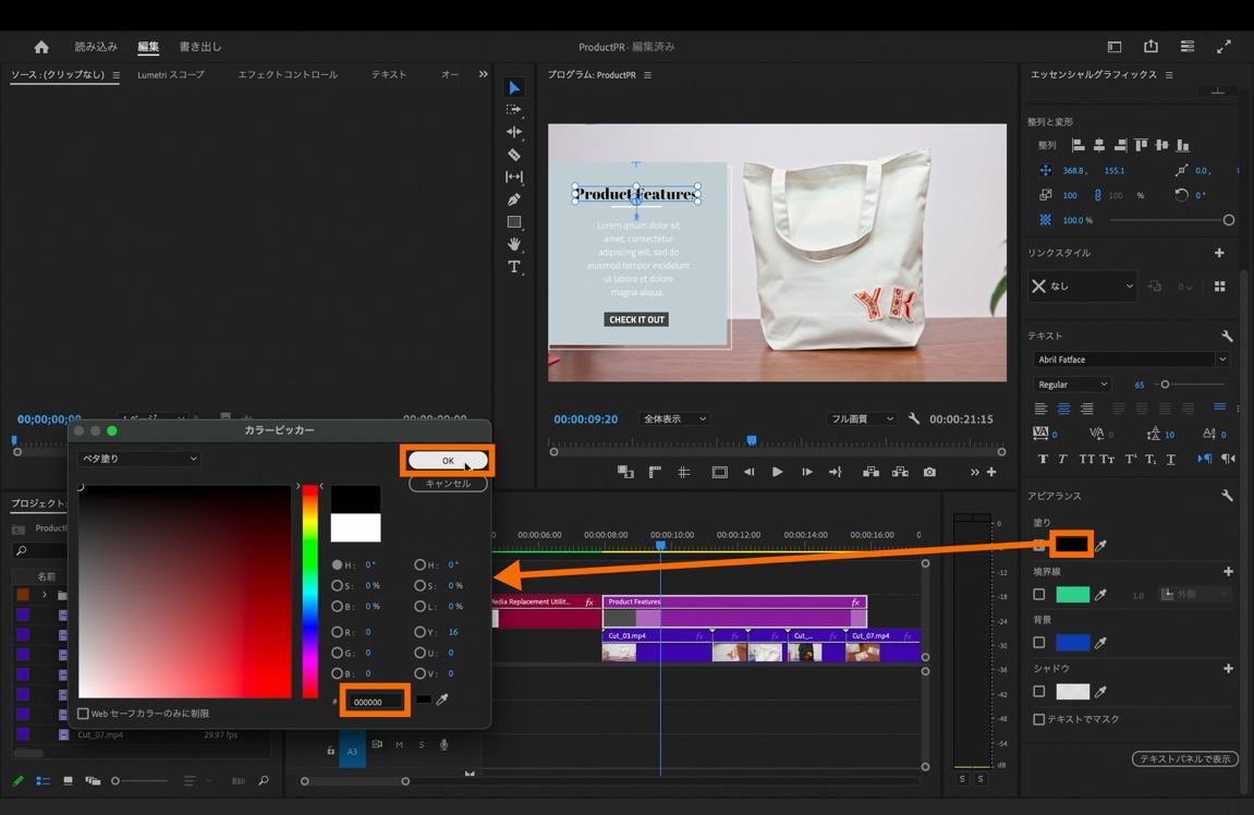 「エッセンシャルグラフィックスパネル」内の「アピアランス」にある「塗り」の横にある色指定の部分をクリックして「カラーピッカー」から色味を選択します。今回は「000000」の黒色を選択。