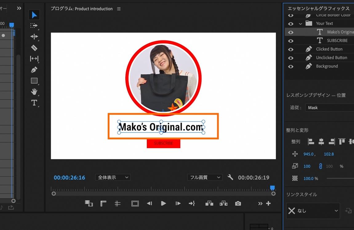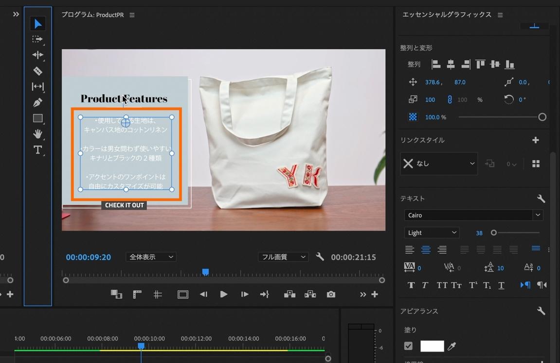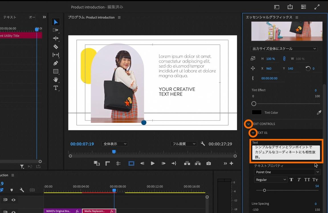 次に、違うモーショングラフィックステンプレートを活用して、商品説明パートを作成します。