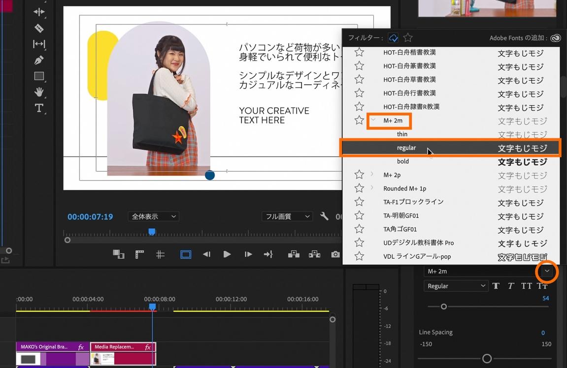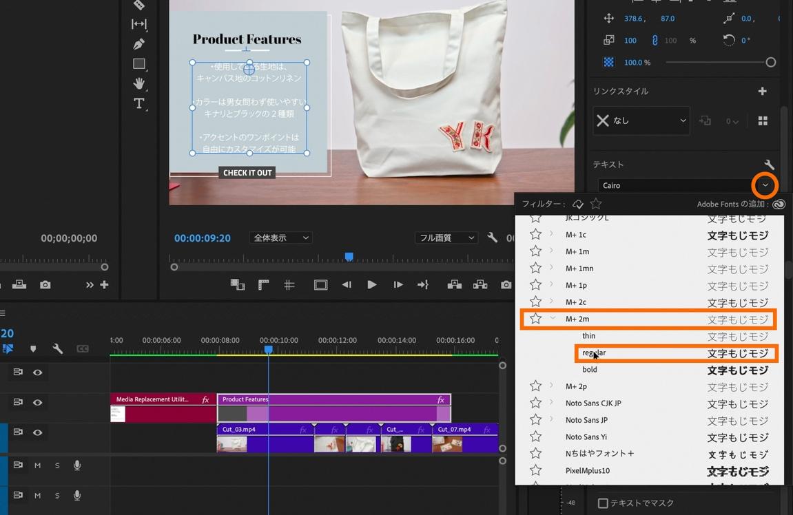 エッセンシャルグラフィックス内の「テキスト」にあるフォント選択のプルダウンの中からご自身の使用したいフォントを選択します。今回は「M+2m」のregularを選択。