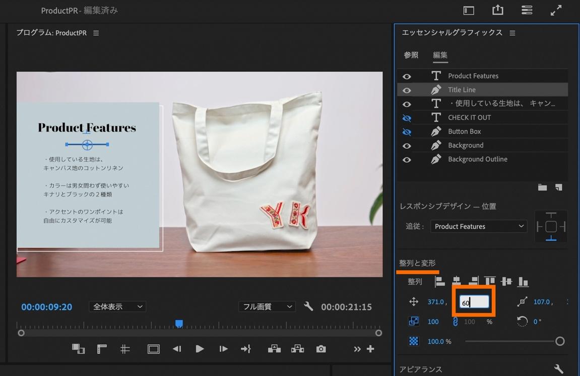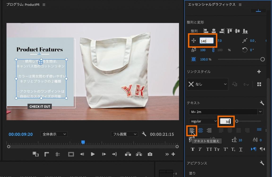 「エッセンシャルグラフィックスパネル」内の上部にある「整列と変形」から、テキスト位置を変更。