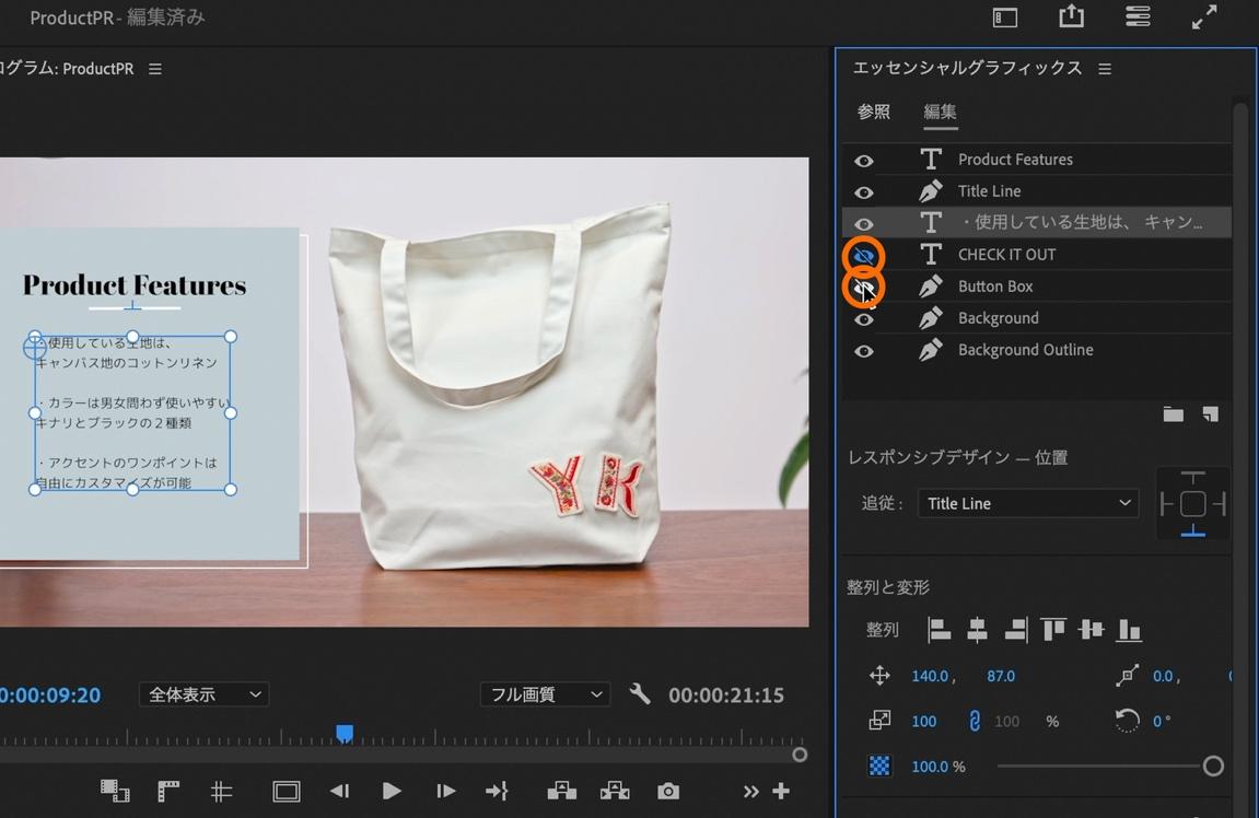「エッセンシャルグラフィックスパネル」内上部の、「CHECK IT OUT」と「Button Box」の横にある目のマークを選択して非表示に変更。