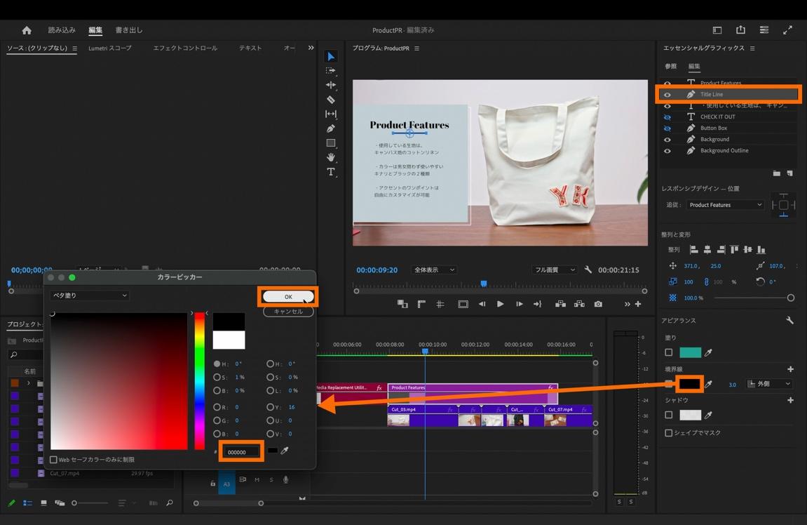 「エッセンシャルグラフィックスパネル」内上部の「Title Line」を選択し、「アピアランス」にある「境界線」の横にある色指定の部分をクリックして「カラーピッカー」から色味を選択します。今回は「000000」の黒色を選択。