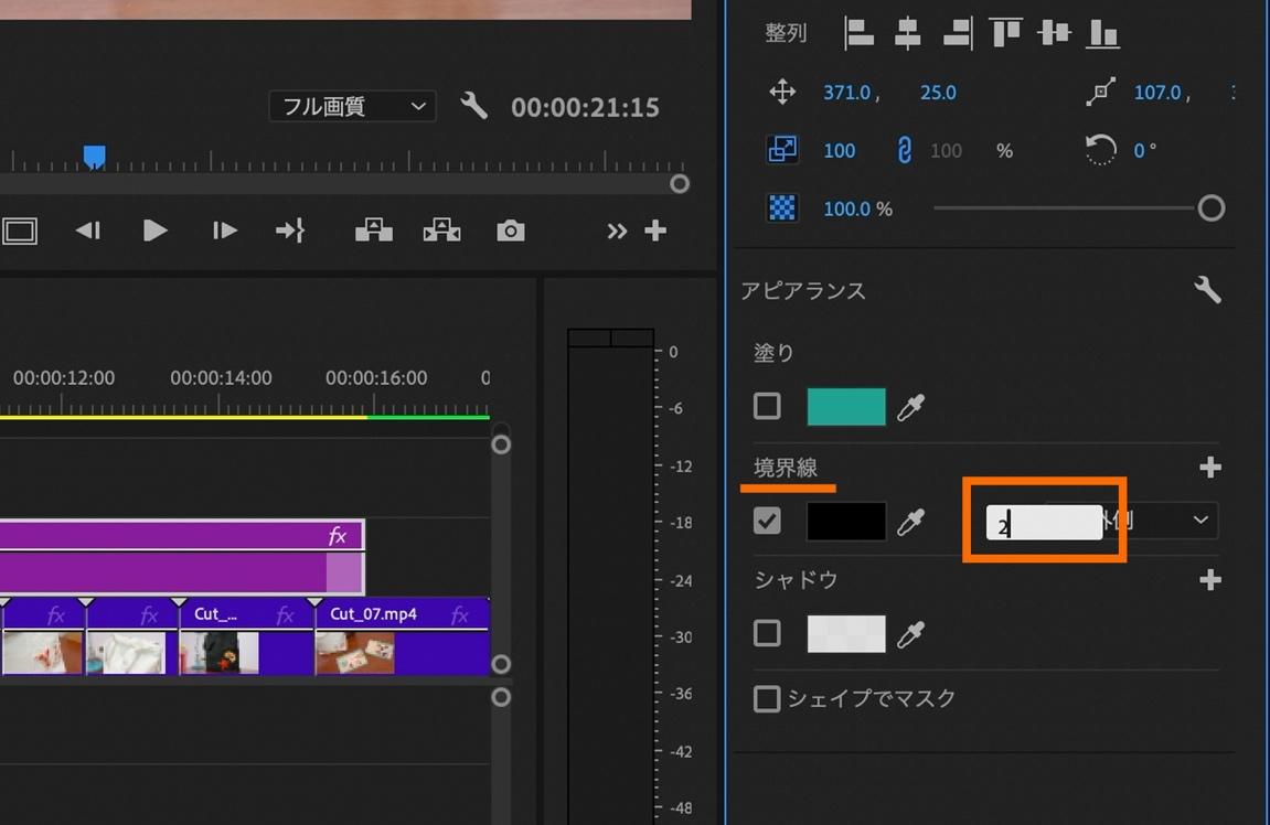 タイムラインパネル左上のタイムコードに「2100」と入力して0:00:21:00に移動。
