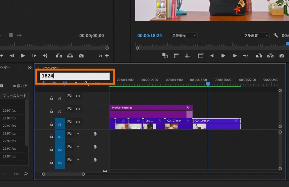 タイムラインパネル左上のタイムコードに「1824」と入力して0:00:18:24に移動。