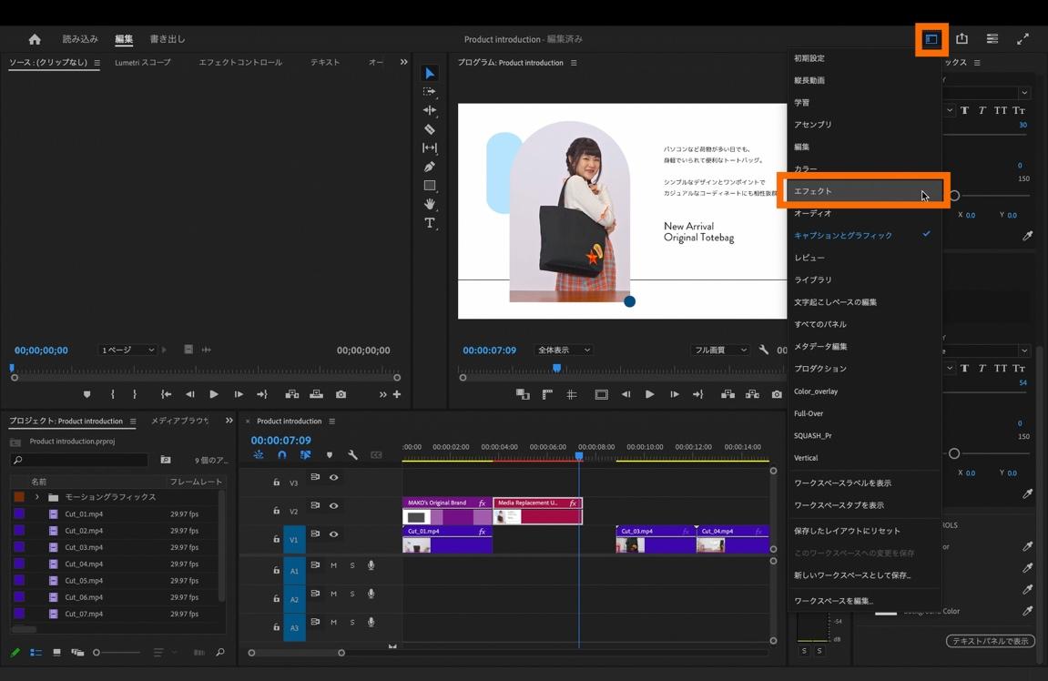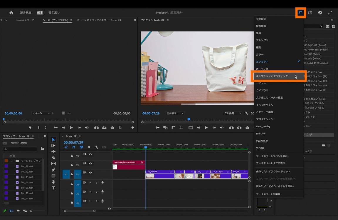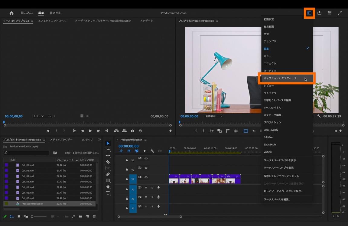 まずは、モーショングラフィックステンプレートを使ってオープニング部分を編集します。画面右上にある「ワークスペース」を選択してワークスペースの表示を「キャプションとグラフィック」に切り替えます。