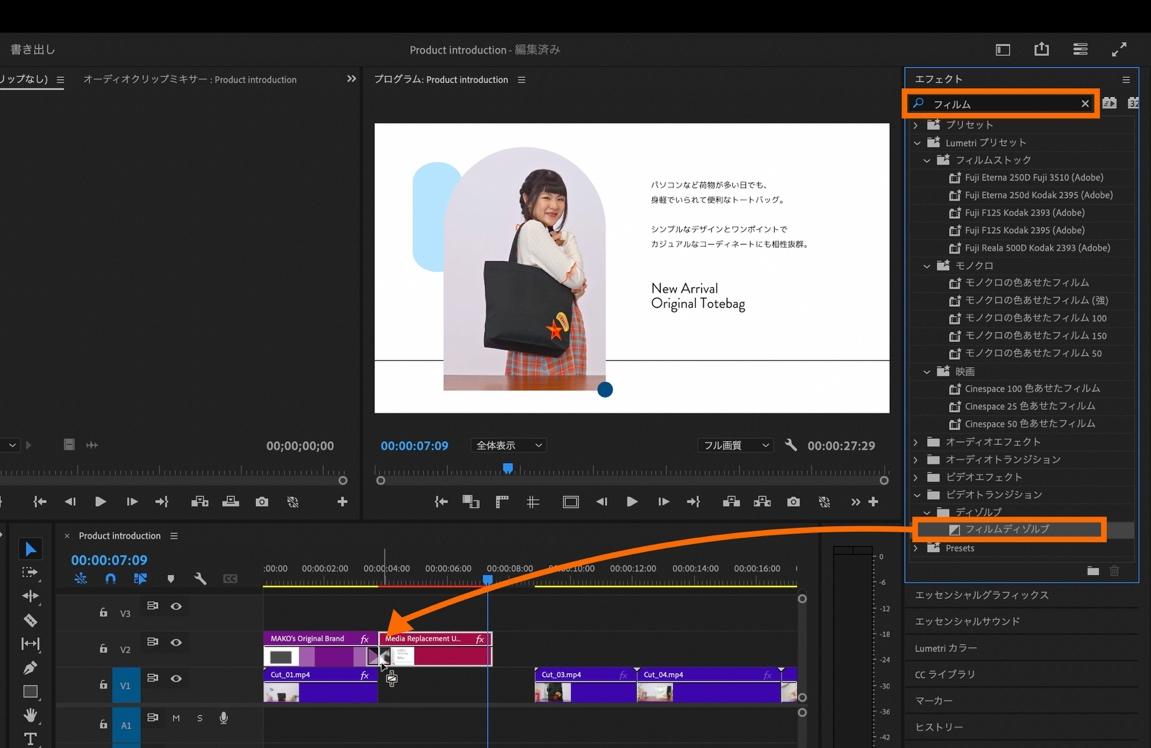 「エフェクトパネル」内の検索フィールドに「フィルム」と入力し「フィルムディゾルブ」のトランジションを該当クリップの間へドラッグ&ドロップ。