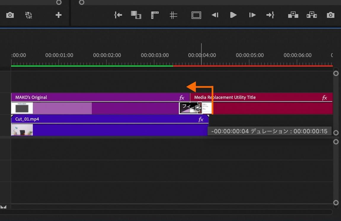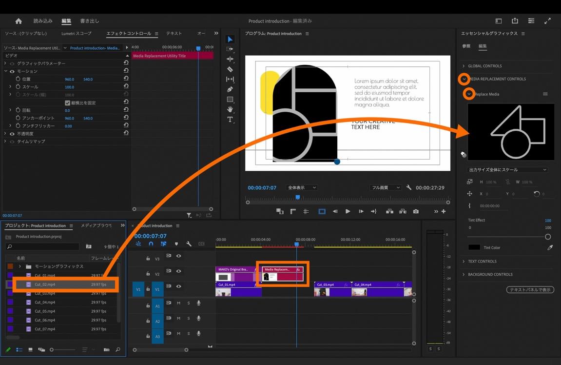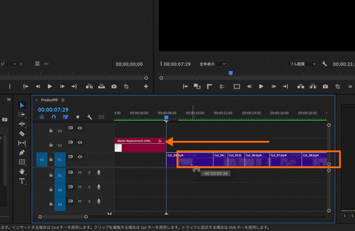 プロジェクトパネル内のCut_02のクリップを「Replace Media」内のクリップ挿入部分にドラッグ&ドロップ。