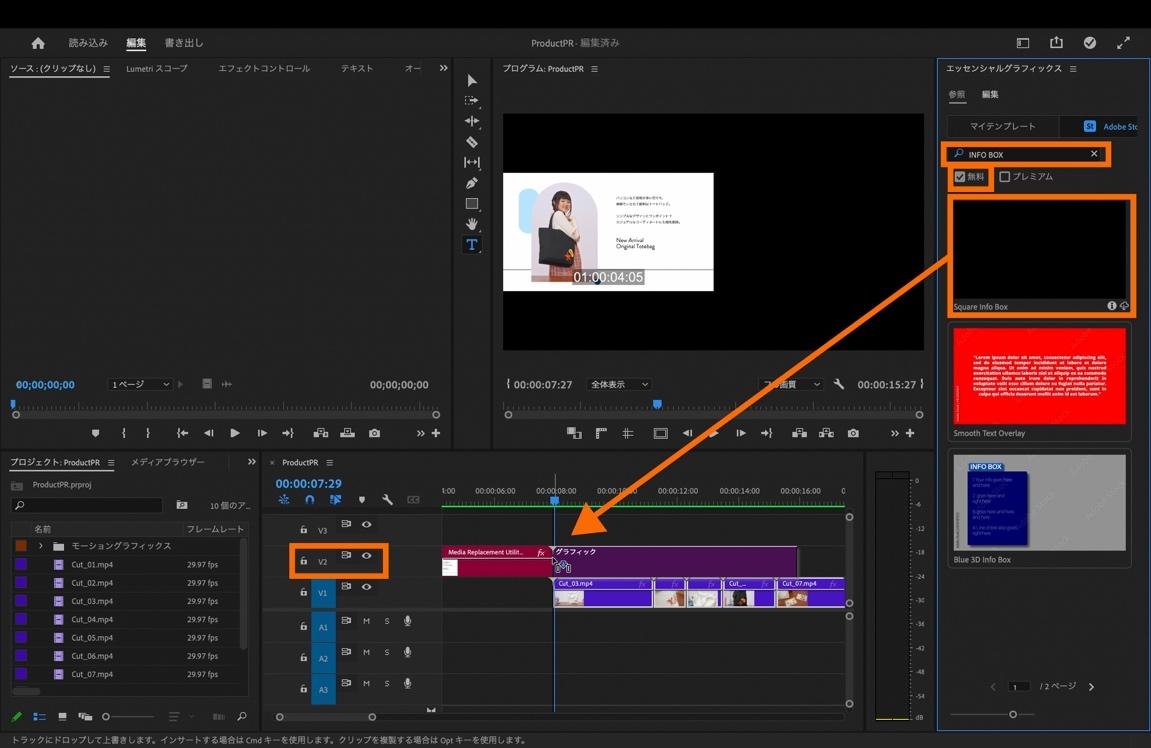 「無料」にチェックを入れたら、パネルの検索フィールドに「INFO BOX」と入力します。「INFO BOX」が表示されたら、タイムラインパネル上の[V2]にドラッグ&ドロップします。