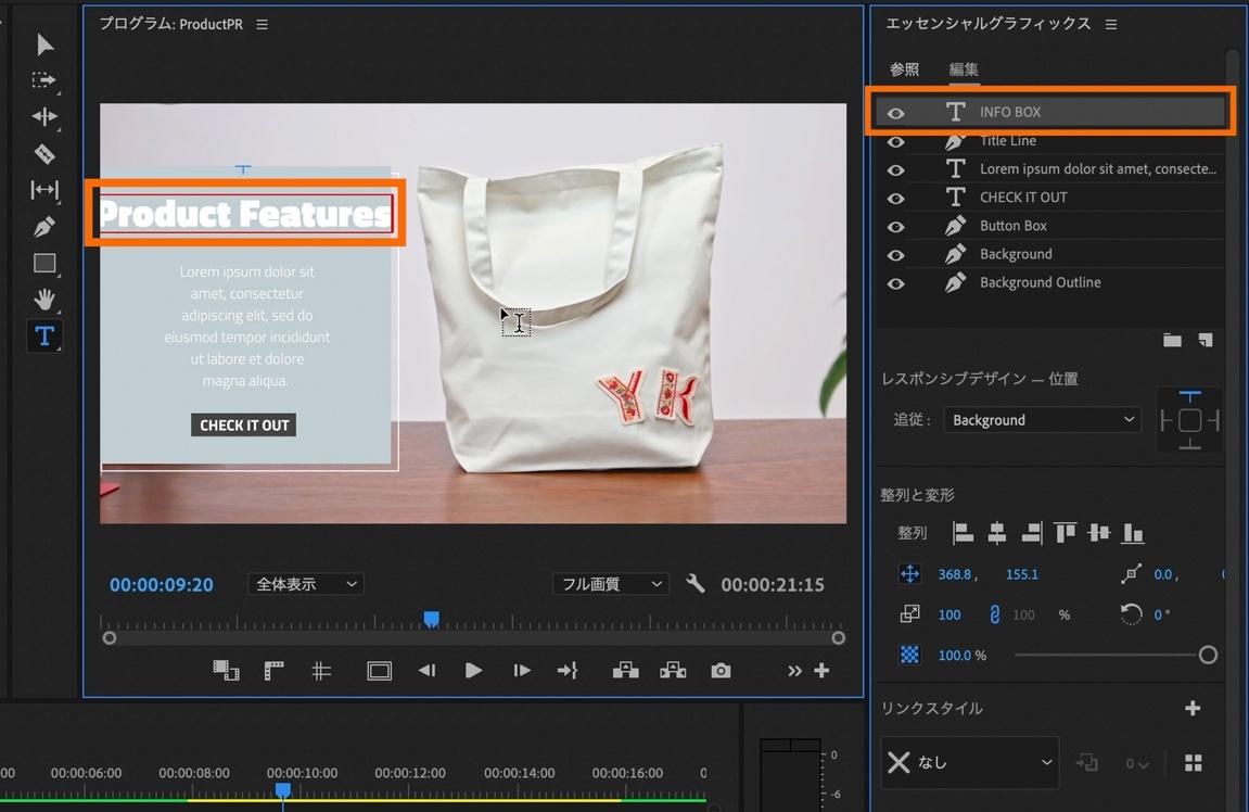 「INFO BOX」を選択。プログラムパネル内の「INFO BOX」のテキスト部分を選択して、既存で入っているサンプルテキストを削除してご自身の表示したいテキストを入力します。今回は「Product Features」と入力。
