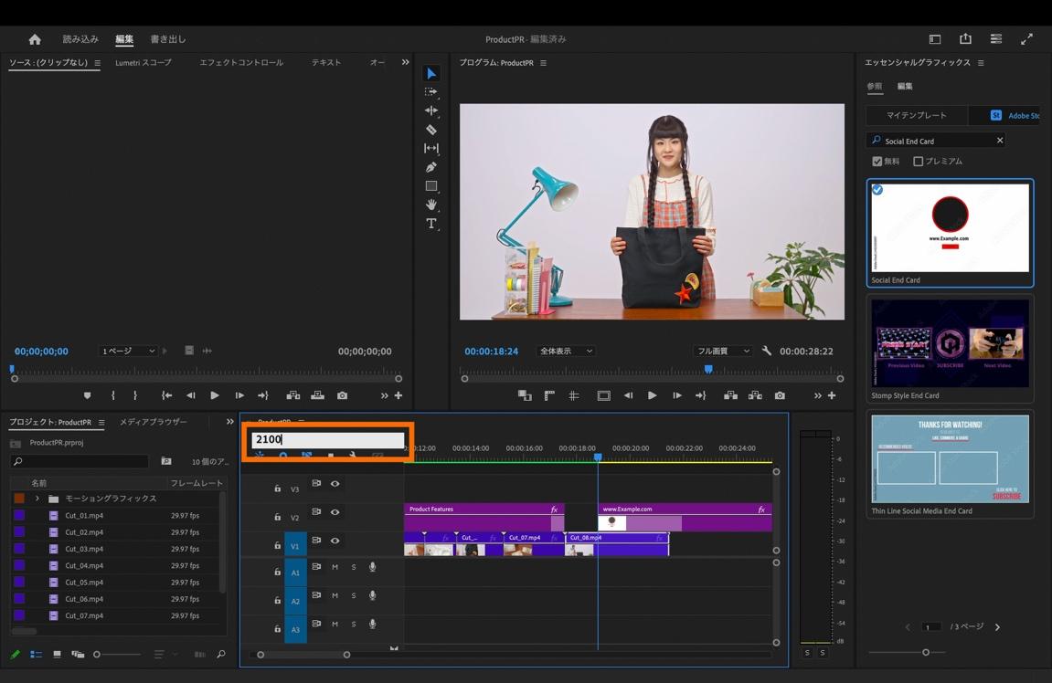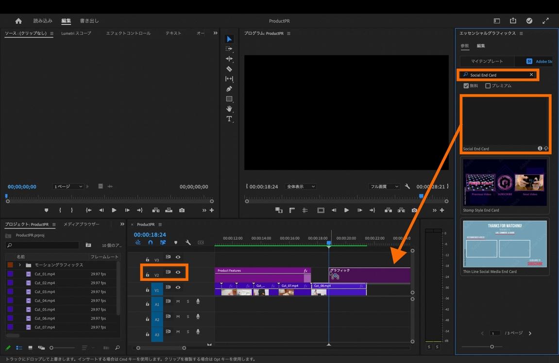 「エッセンシャルグラフィックス」パネル内の、「参照」の中にある「Adobe Stock」を選択し、パネルの検索フィールドに「Social End Card」と入力します。「Social End Card」が表示されたら、タイムラインパネル上[V2]の0:00:18:24にあわせてドラッグ&ドロップします。