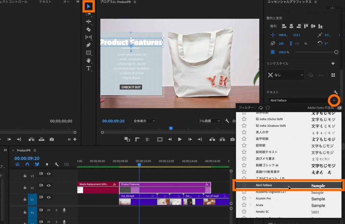ツールバーを「選択ツール」に切り替えて、エッセンシャルグラフィックス内の「テキスト」内にあるフォント選択のプルダウンの中からご自身の使用したいフォントを選択します。今回は「Abril Fatface」を選択。