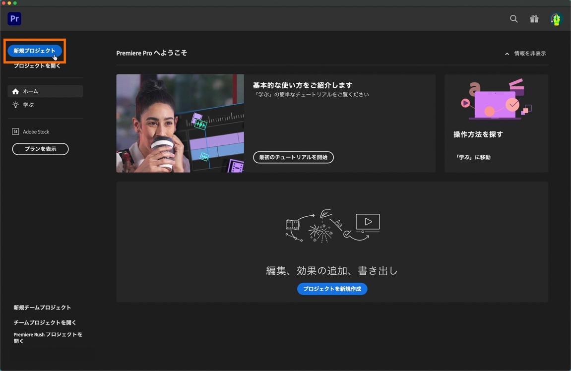 Premiere Proを起動してプロジェクトの新規作成画面を表示して、「新規プロジェクト」を選択します。