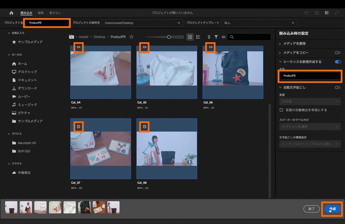 プロジェクトの新規作成画面が表示されたら、プロジェクト名とシーケンス名を任意で設定。今回は「ProductPR」に変更し、「ローカル」の欄から事前にダウンロードした素材を選んでチェックボックスにチェックを入れて右下の「作成」を選択します。
