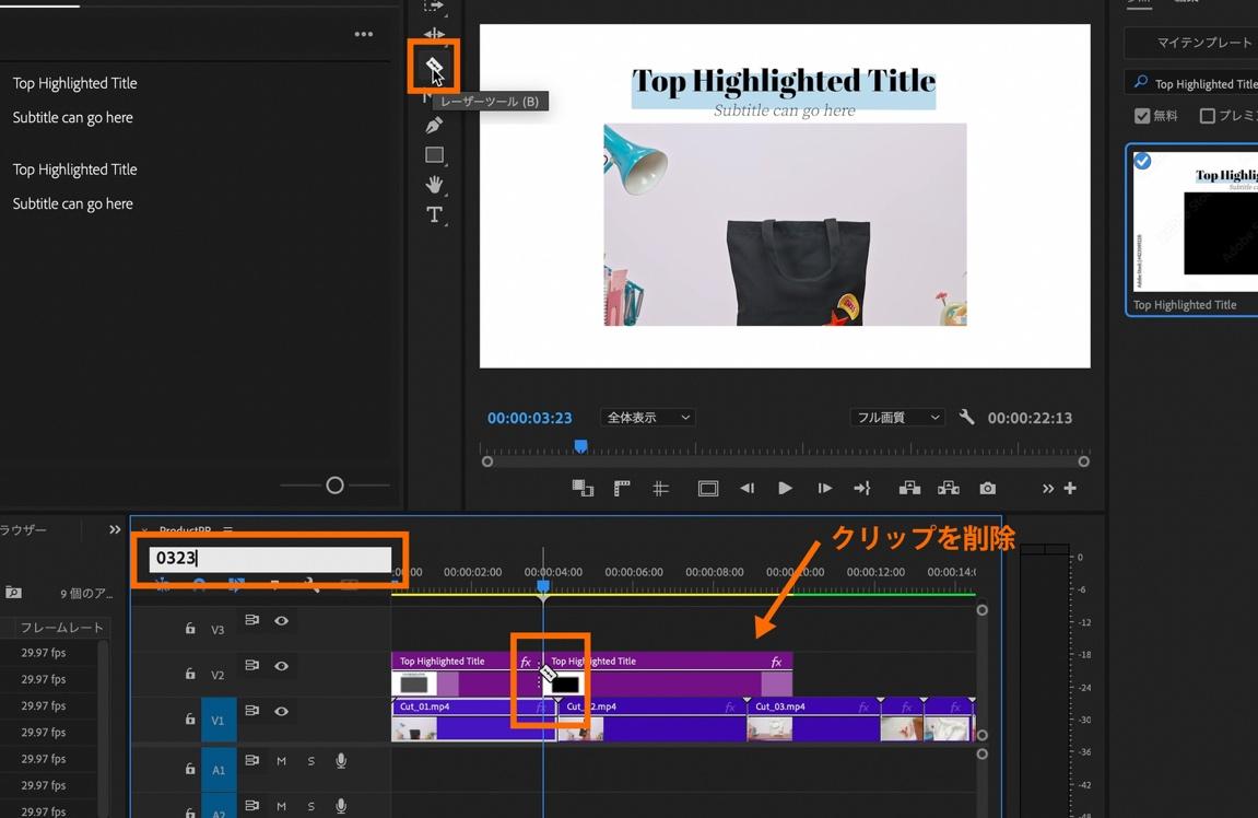 ツールバーの中から「レーザーツール」を選択し、V2に配置したモーショングラフィックステンプレートを再生ヘッドのある0:00:03:23の時点でカット。