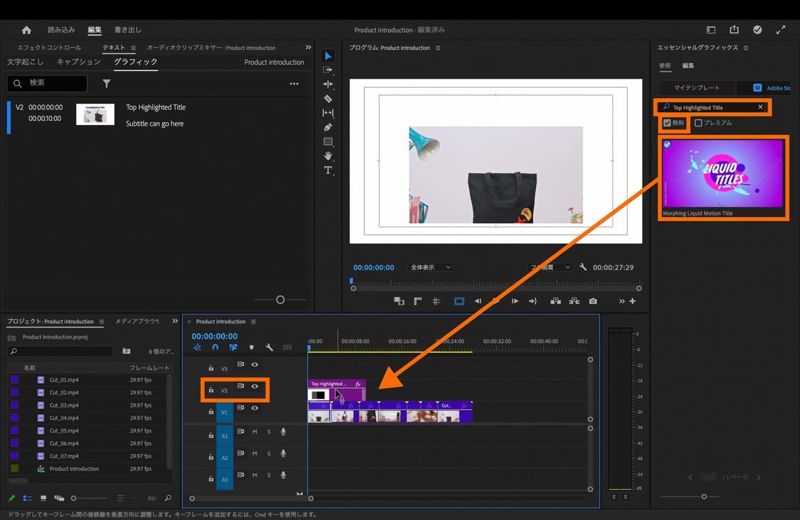 「無料」にチェックを入れたら、パネルの検索フィールドに「Top Highlighted Title」と入力します。「Top Highlighted Title」が表示されたら、タイムラインパネル上の[V2]にドラッグ&ドロップします。