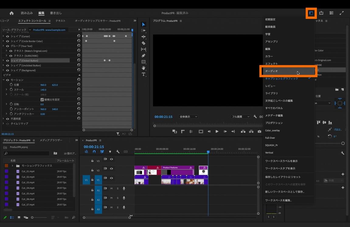 最後に音楽を追加して、動画を仕上げます。オーディオの編集なので、画面右上にある「ワークスペース」を選択してワークスペースの表示を「オーディオ」に切り替えます。