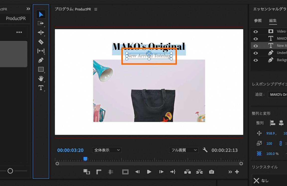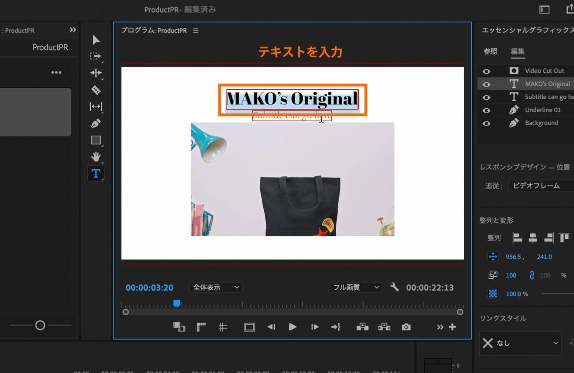 モーショングラフィックステンプレートの文字内容を変更する為に、タイムライン上の再生ヘッドをテキストが全て表示されているタイミング(00:00:03:20)まで移動させます。